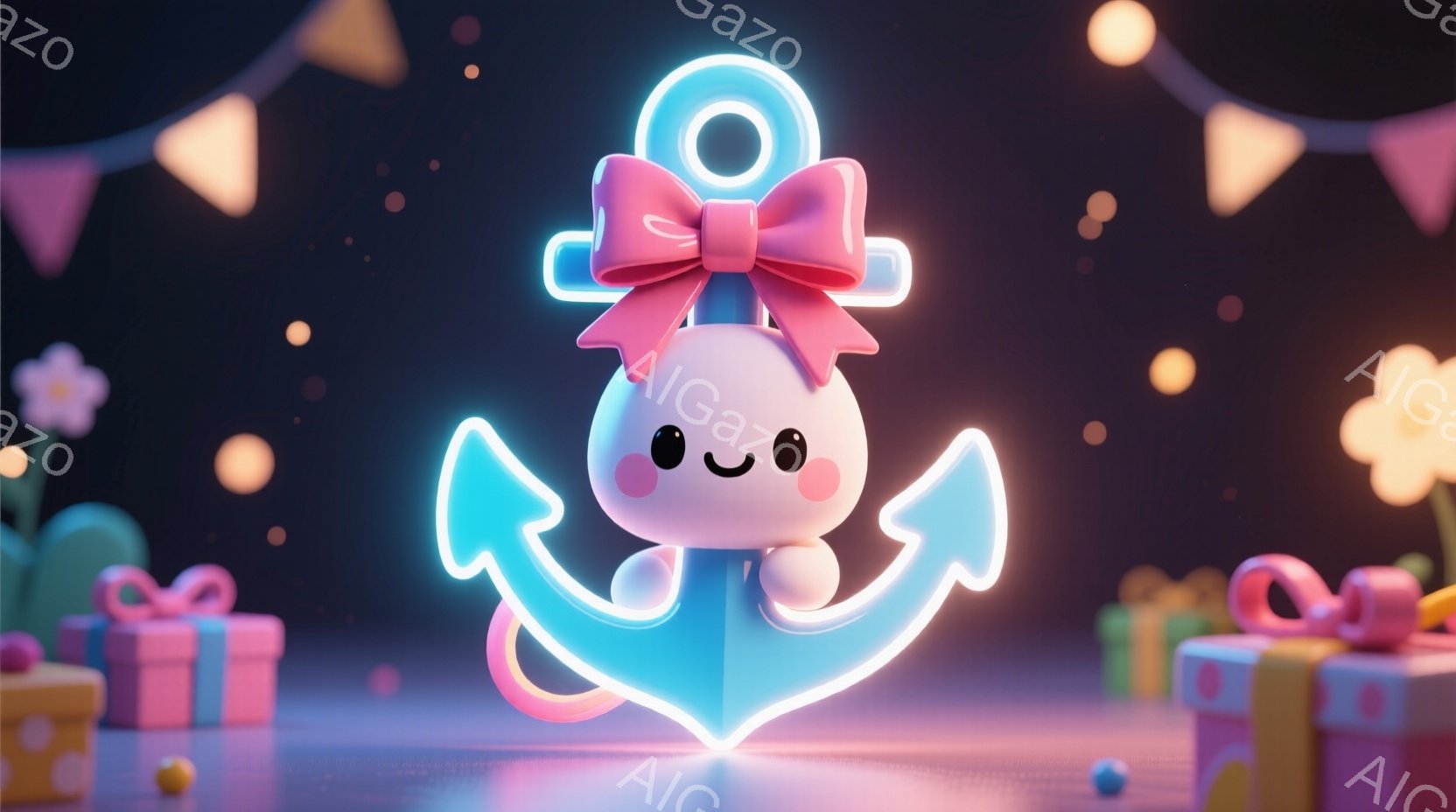 明るいネオンブルーの錨が、可愛らしいピンクのリボンで飾られています。錨は微笑んでおり、全体的に暖かく、お祝いのような雰囲気です。背景は暗い青色で、様々な色の光る球体が散りばめられ、さらにピンクや水色のギフトボックスが配置されています。