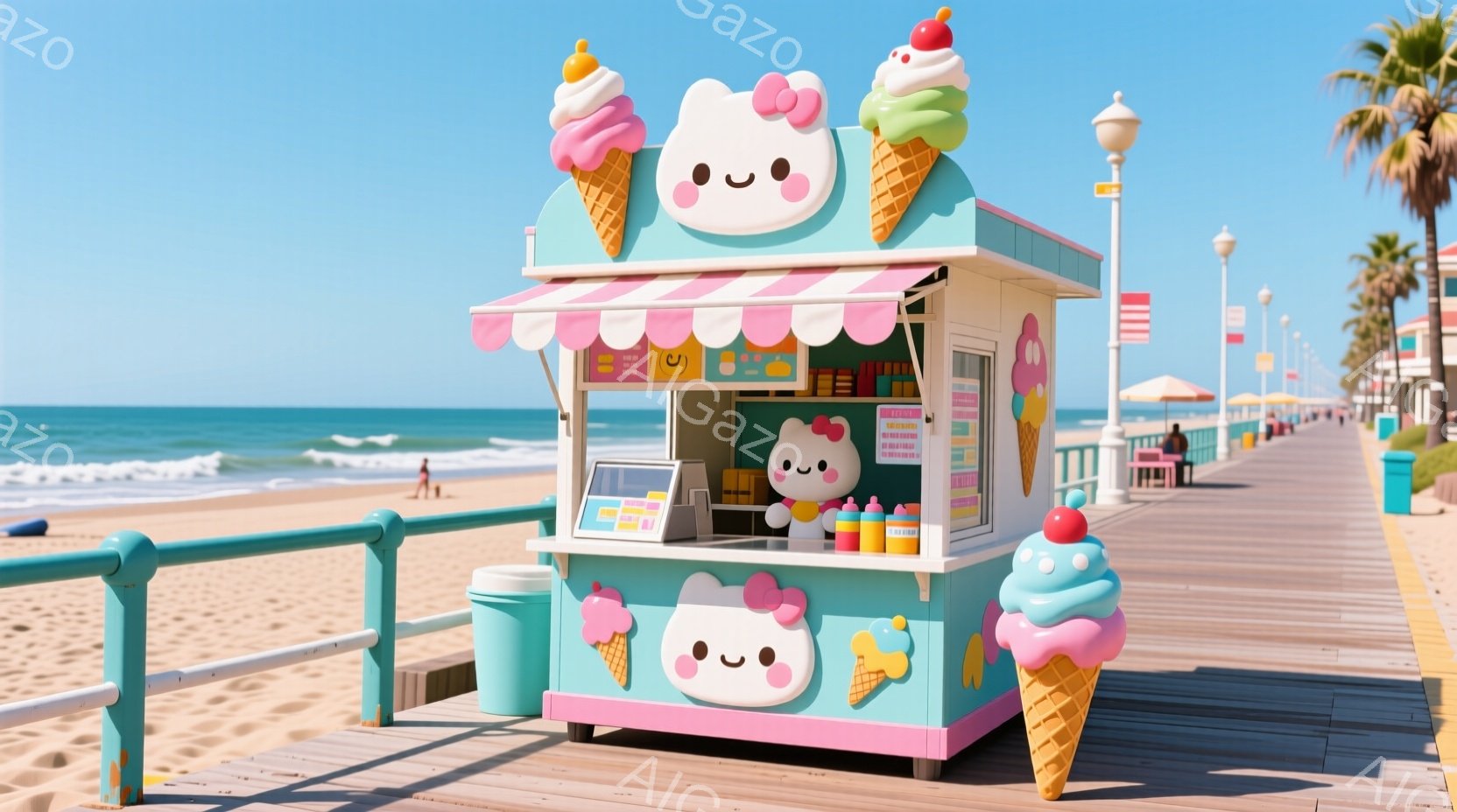 明るい青空の下、木製の遊歩道に可愛らしいアイスクリーム屋台が建っています。茶色の髪を短く切った女性が、笑顔でアイスクリームを準備しており、屋台は大きなアイスクリームの形をした装飾と、パステルカラーで彩られています。背景には、パラソルとビーチチェアが並び、遠くには穏やかな海とヤシの木が見え、全体的に明るく楽しい雰囲気が漂っています。