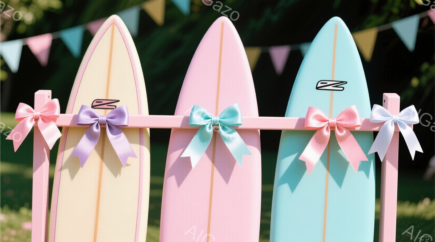 鮮やかなピンクと水色の可愛いアイスクリーム屋台が、木製の遊歩道に置かれています。屋台には、大きな笑顔のキャラクターが描かれており、メニューや商品が並んでいます。背景には青い海、砂浜、ヤシの木が見え、晴れた日の賑やかな雰囲気が漂っています。