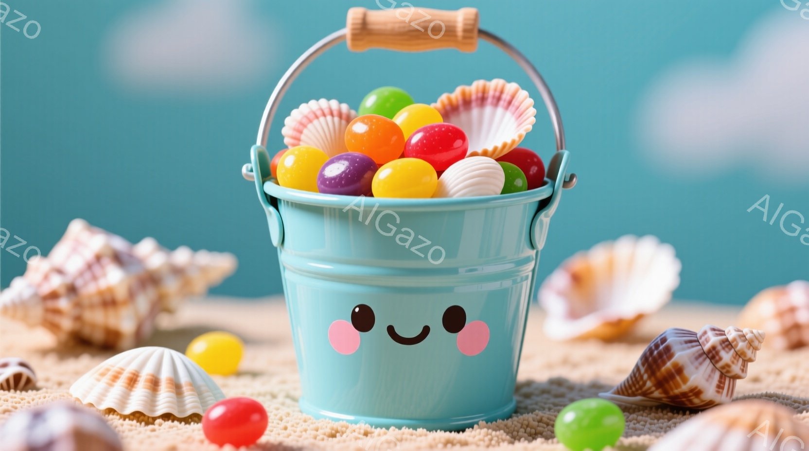 水色のバケツが砂浜に置かれ、中にカラフルな貝殻とゼリービーンズが満たされています。バケツには可愛らしい顔が描かれており、周りにはさまざまな種類の貝殻が散らばっています。背景は明るい青空と砂浜で、夏らしい穏やかな雰囲気を醸し出しています。