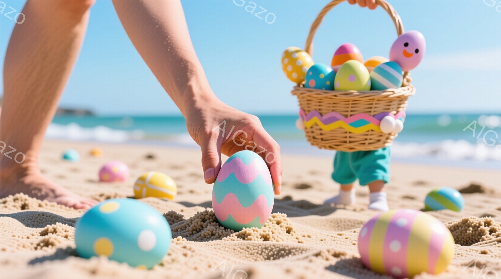 赤ちゃんが砂浜でカラフルなイースターエッグに囲まれて遊んでいます。ピンクと水色のストライプの服を着ており、金髪で明るい表情をしています。背景には青い海と空が広がり、晴れた日の穏やかな雰囲気が漂っています。
