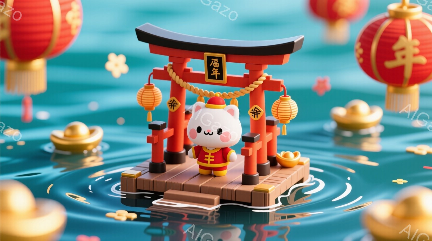 この無料AI生成画像「小さな赤い鳥居が水の上に浮かんでおり、その上に白いウサギのキャラクターが立っています。ウサギはシンプルで可愛らしいデザインで、丸い目と小さな口で無表情です。背景には、水面に反射した赤い提灯や蓮の花が浮かび、穏やかで幻想的な雰囲気を醸し出しています。」は、2025年10月23日に作成されました。 サイズは 1664×928px の高解像度で、商用利用も可能なフリー素材として提供しています。