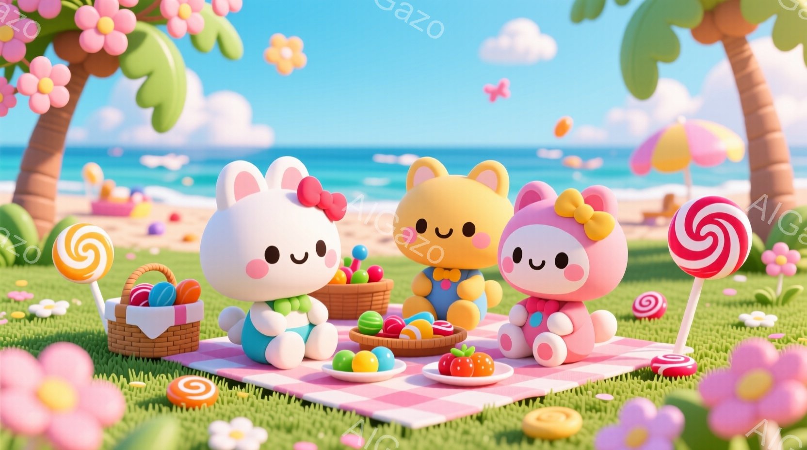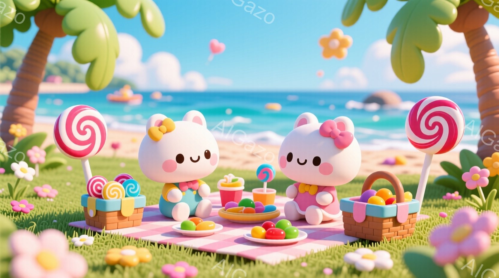 ふわふわの白いウサギが二人、ピンクと白のチェックの敷物の上でピクニックを楽しんでいます。ウサギたちはピンクのリボンで髪を結び、それぞれ黄色とピンクの可愛らしい服を着ています。背景には青い海、ヤシの木、ピンクの花が咲き乱れ、甘くて夢のような雰囲気です。