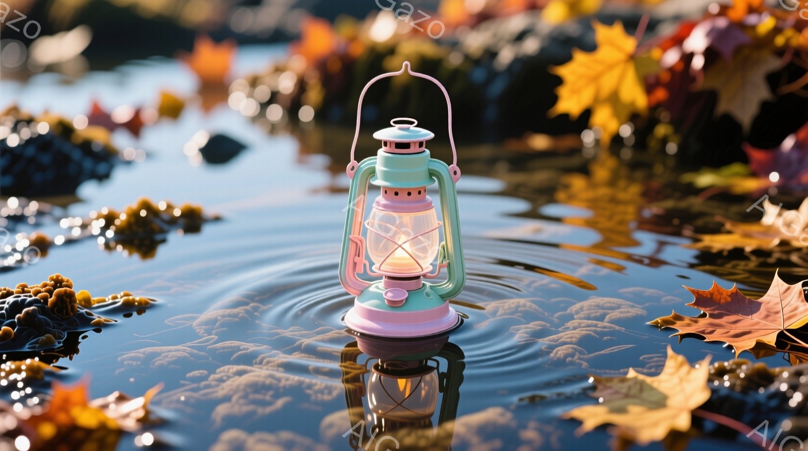 水面に浮かぶ、淡い水色の提灯が印象的な光景です。提灯の中にはピンク色のロウソクが灯り、水面に揺らめく光が穏やかな雰囲気を醸し出しています。周囲には赤や黄色の落ち葉が浮かび、秋の静けさと暖かさを感じさせる美しい情景です。