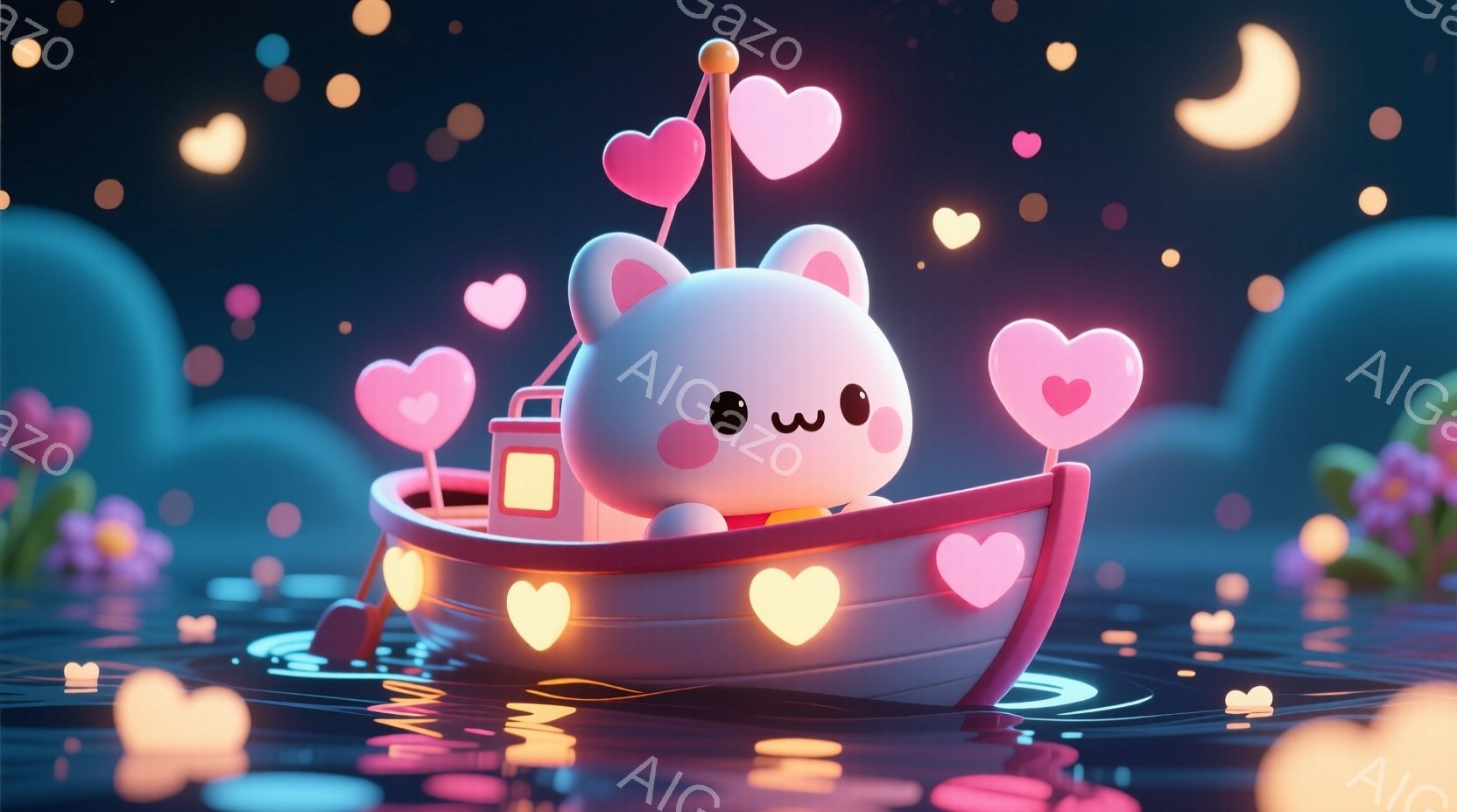 ピンク色の可愛らしい船に乗った、丸くて白い生き物が描かれています。その生き物はつぶらな瞳で微笑んでおり、周囲にはハート型の光が浮かんでいます。背景は暗く、水面にはハート型の光が反射しており、ロマンチックで夢幻的な雰囲気を醸し出しています。