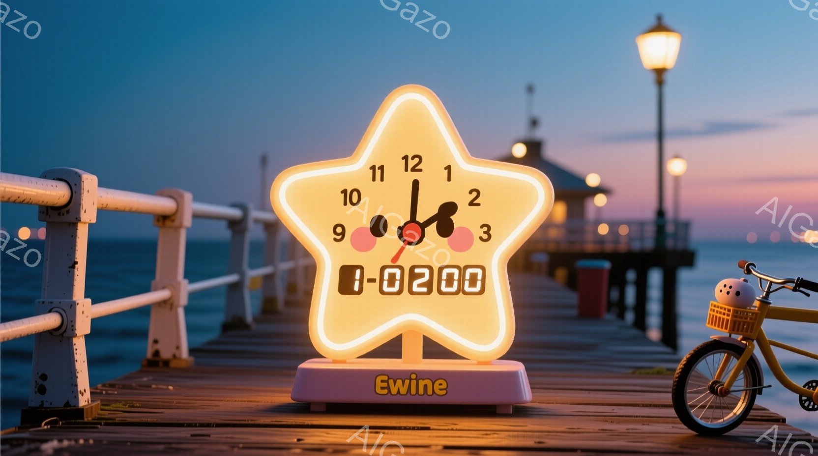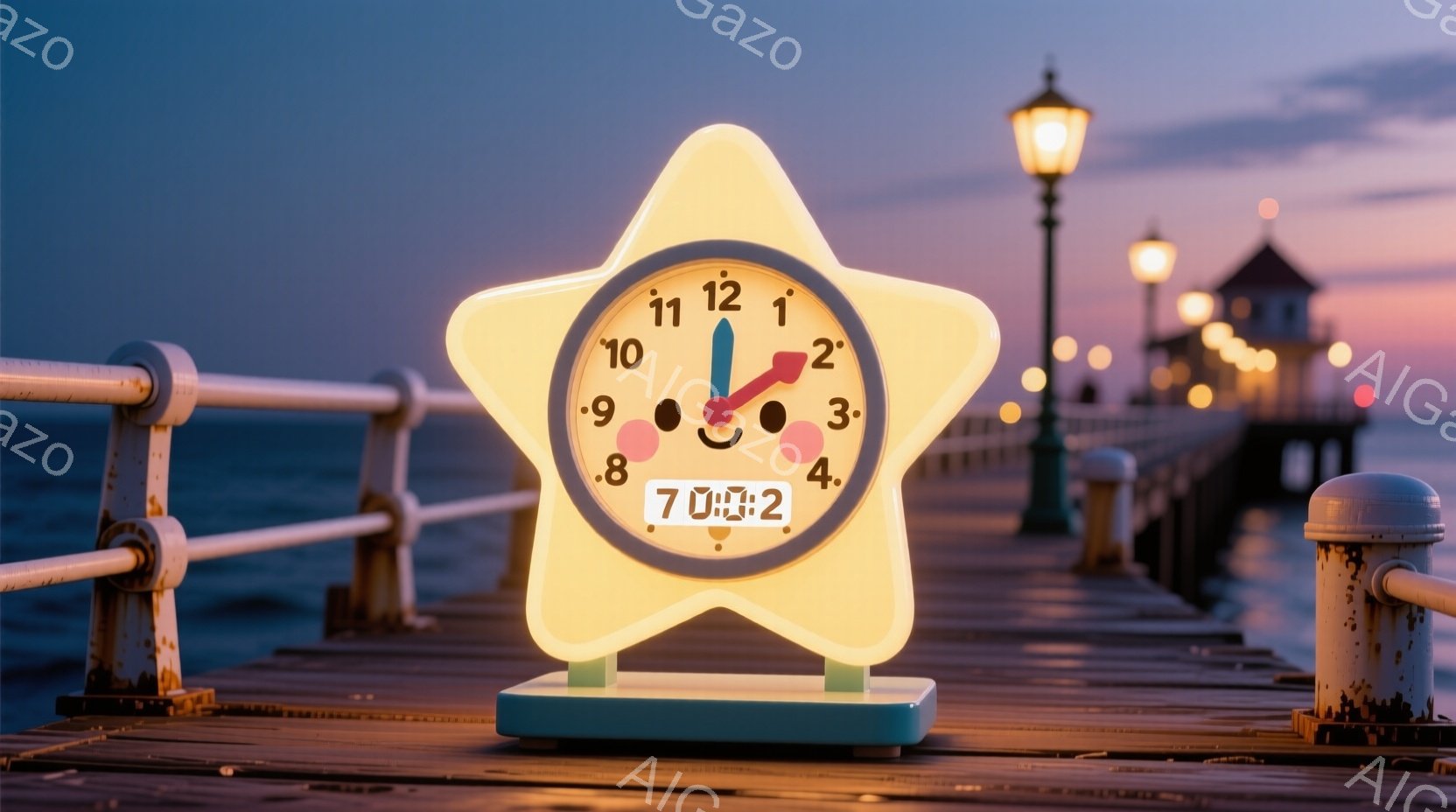 桟橋の上に置かれた星型の時計が写っています。時計はクリーム色で、ピンク色の星の飾りがあり、時刻はほぼ2時半を示しています。背景には穏やかな海と、夕焼け空が広がり、桟橋にはロープと柱が並び、全体的に暖かく、のどかな雰囲気を醸し出しています。