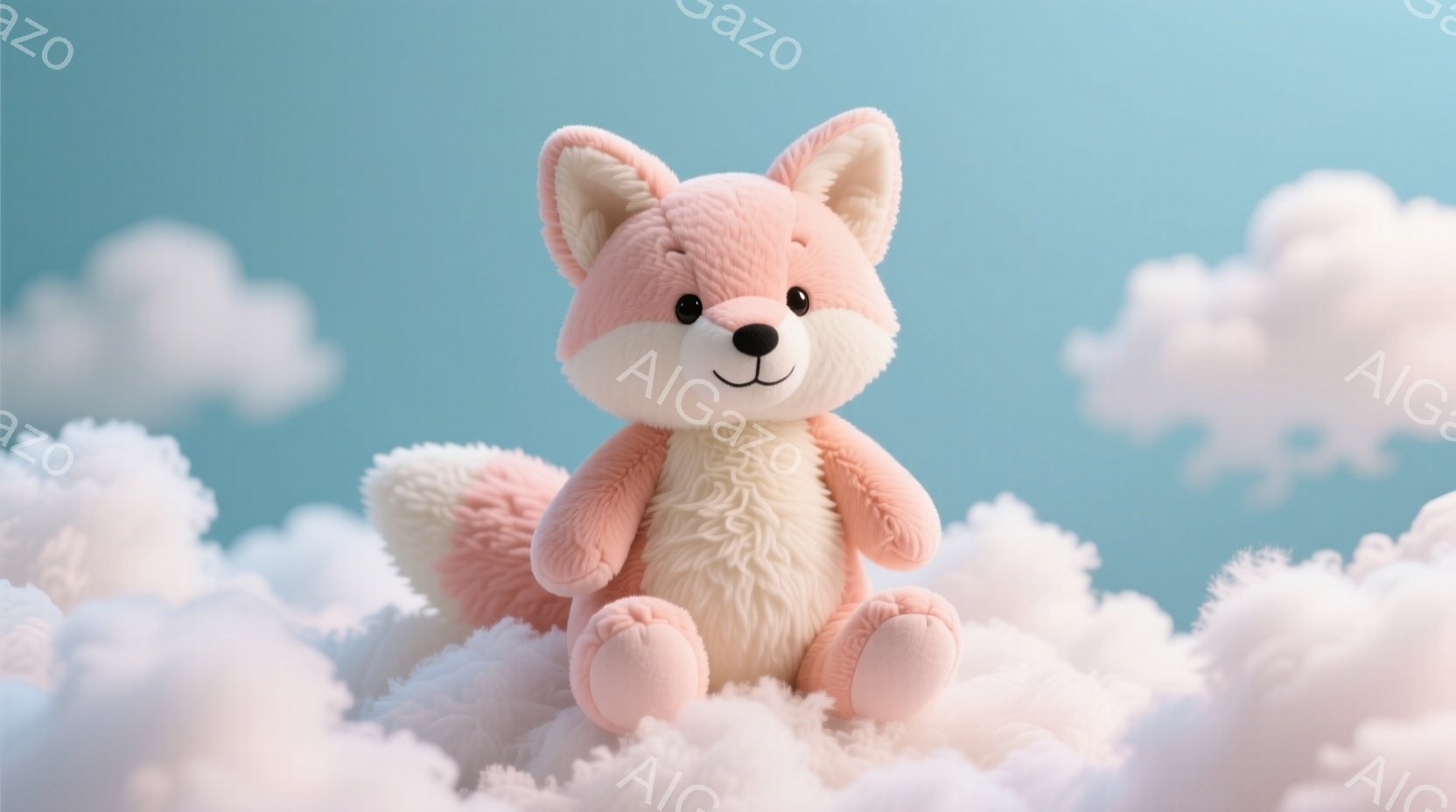 ふわふわとしたピンクとオレンジ色の毛並みを持つ子ギツネのぬいぐるみです。丸い頬と愛らしい表情で、雲の上に座ってこちらを見ているようです。背景は穏やかな水色の空と白い雲で、全体的に柔らかく優しい雰囲気です。