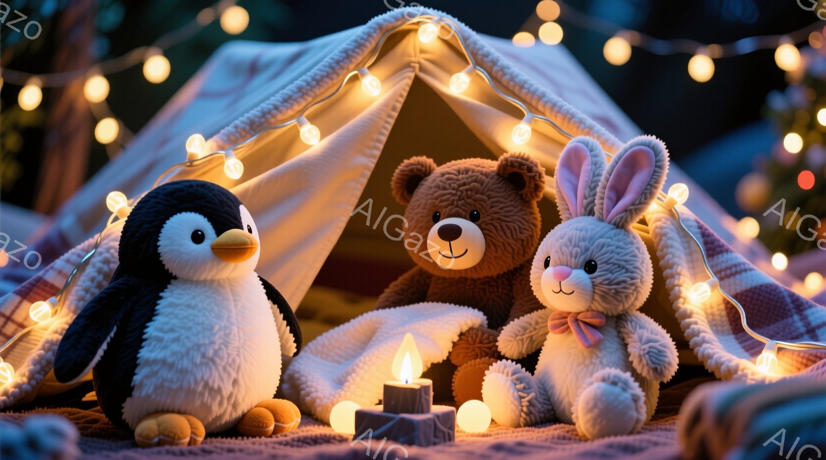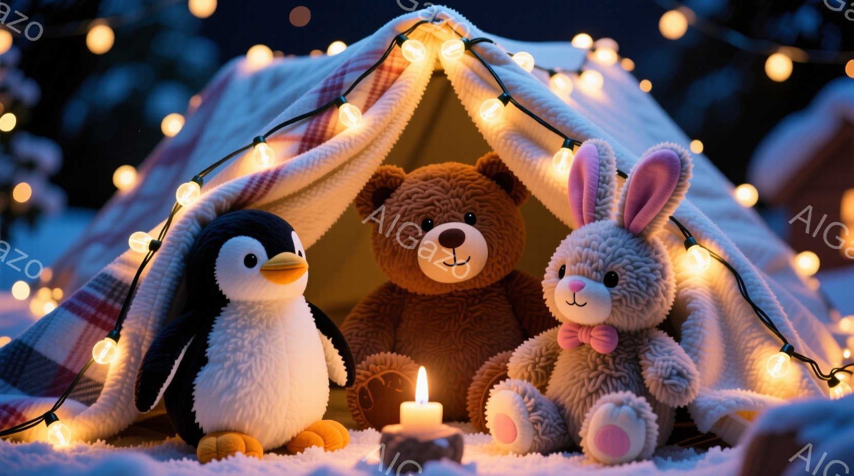 ぬいぐるみのアザラシ、クマ、ウサギが、光るガーランドで飾られた暖かいテントの中に座っています。アザラシはオレンジ色の小さなスカーフを巻き、クマとウサギはリラックスした表情で、穏やかな雰囲気を醸し出しています。背景には小さな家と雪景色がぼやけて見え、冬の暖かく心地よい夜を思わせます。