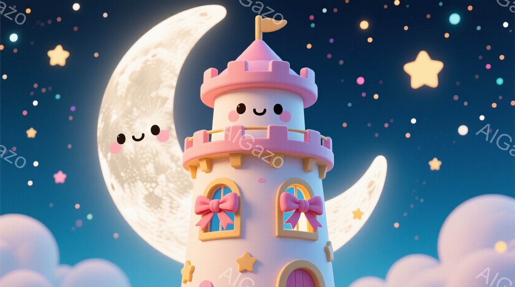 夜空を背景に、可愛らしい月の塔が描かれています。塔はピンク色で、リボンや星の装飾が施され、おとぎ話のような雰囲気を醸し出しています。背景にはふわふわとした雲と星が散りばめられており、夢のような幻想的な世界観を作り出しています。