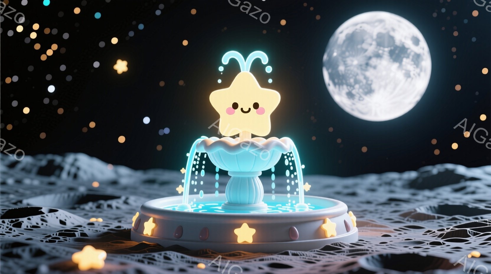 満月を背景に、星型の水が流れる噴水が描かれています。噴水の中心には、笑顔の星のキャラクターがいて、周りには小さな星型のライトが浮かんでいます。全体的に夜空を模したような、幻想的で可愛らしい雰囲気です。