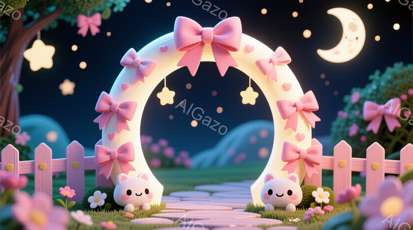 柔らかいピンク色のアーチが印象的な画像です。アーチにはカラフルなリボンや旗が飾られており、中央には可愛らしい笑顔のピンク色のドアがあります。背景には緑の草地と花々が広がり、優しい光の星が夜空を彩る、夢のような雰囲気が漂っています。