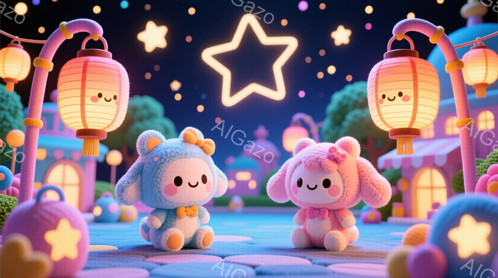 ふわふわとした毛並みのうさぎのキャラクターが二人、夜の公園らしき場所で楽しんでいます。ピンクと黄色の服を着て、それぞれ赤いリボンをつけており、穏やかな笑顔を浮かべています。背景には、ライトアップされた可愛らしい建物、星空、そして柔らかな光を放つランプがあり、ファンタジーで温かい雰囲気を醸し出しています。