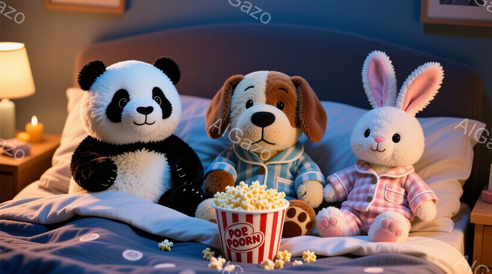 ベッドの上にパンダ、犬、ウサギのぬいぐるみたちが座っています。パンダは黒い毛並みで、犬は水色のパジャマを着ており、ウサギはピンク色のパジャマを着ています。ポップコーンの入った赤いバケツがぬいぐるみたちの間に置かれており、周りにポップコーンが散らばっています。