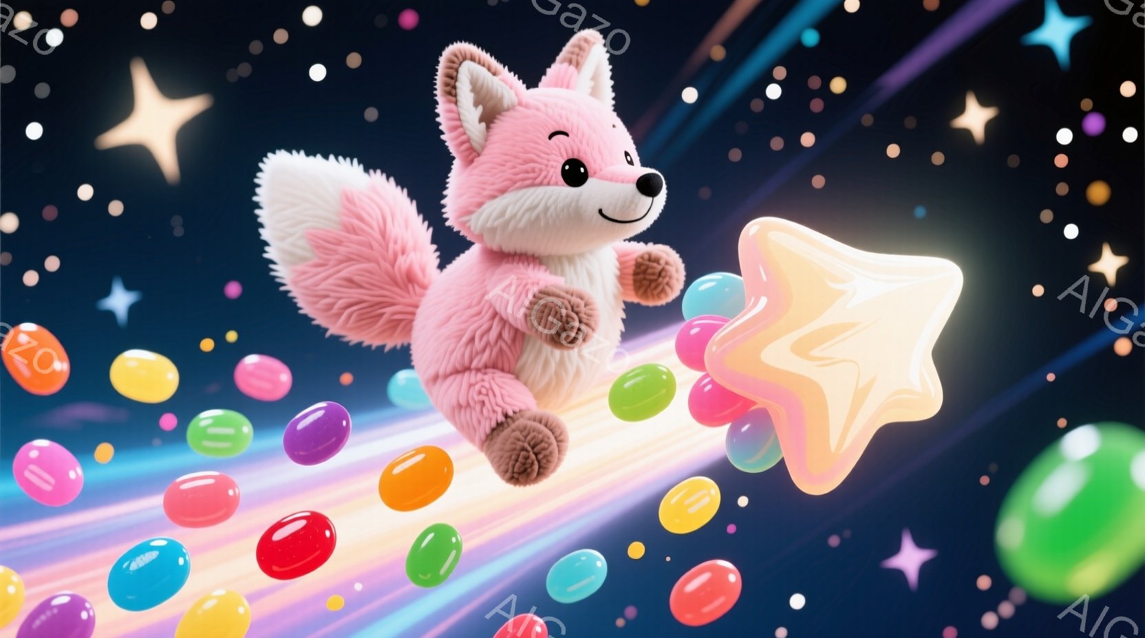 明るいピンク色の毛並みを持つ小さな狐が、黄色い星のようなキャンディーを手に、空を飛んでいる様子が描かれています。背景には虹色の光の筋と、様々な色のゼリービーンズのようなキャンディーが浮かび、まるで夢のような空間を作り出しています。全体的に、可愛らしく、遊び心に満ちた、幻想的な雰囲気です。
