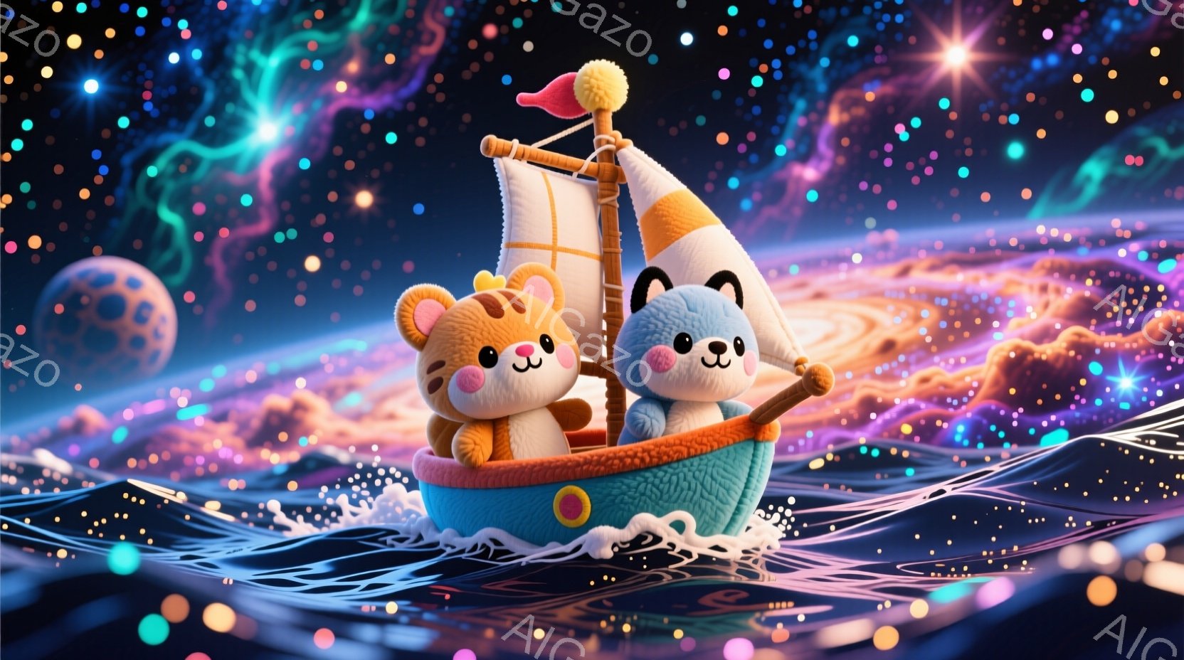 ふわふわの白い子犬が、小さな青いボートに乗って波の上を航海しています。子犬はピンクの頬と愛らしい表情をしており、頭には小さな金色の角が生えています。背景はカラフルな光の線が渦巻く幻想的な海で、全体的に夢のような雰囲気です。