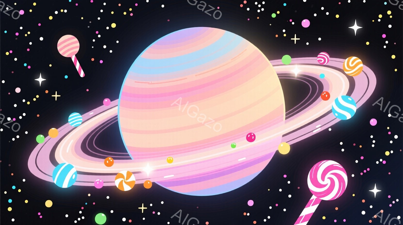 惑星が明るい背景に浮かび、周囲にはキャンディが散りばめられています。惑星はピンクと紫のグラデーションで、環は明るい色合いのキャンディで装飾され、夢のような雰囲気を醸し出しています。星屑のような細かい光が背景に散りばめられ、全体的にファンタジックで可愛らしい印象を与えます。