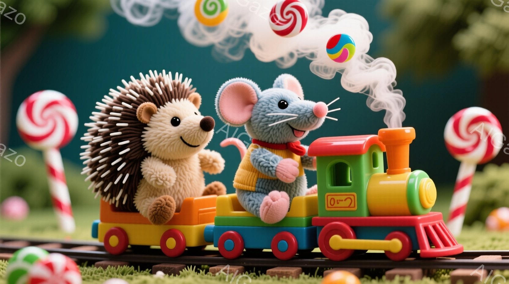 可愛らしいハリネズミとネズミが、カラフルな列車に乗って楽しそうに走っている様子が描かれています。ハリネズミは赤いスカーフを巻いており、ネズミは黄色いリボンをつけています。背景には、キャンディや緑の草が生い茂り、楽しい雰囲気の遊園地のような場所であることが伺えます。