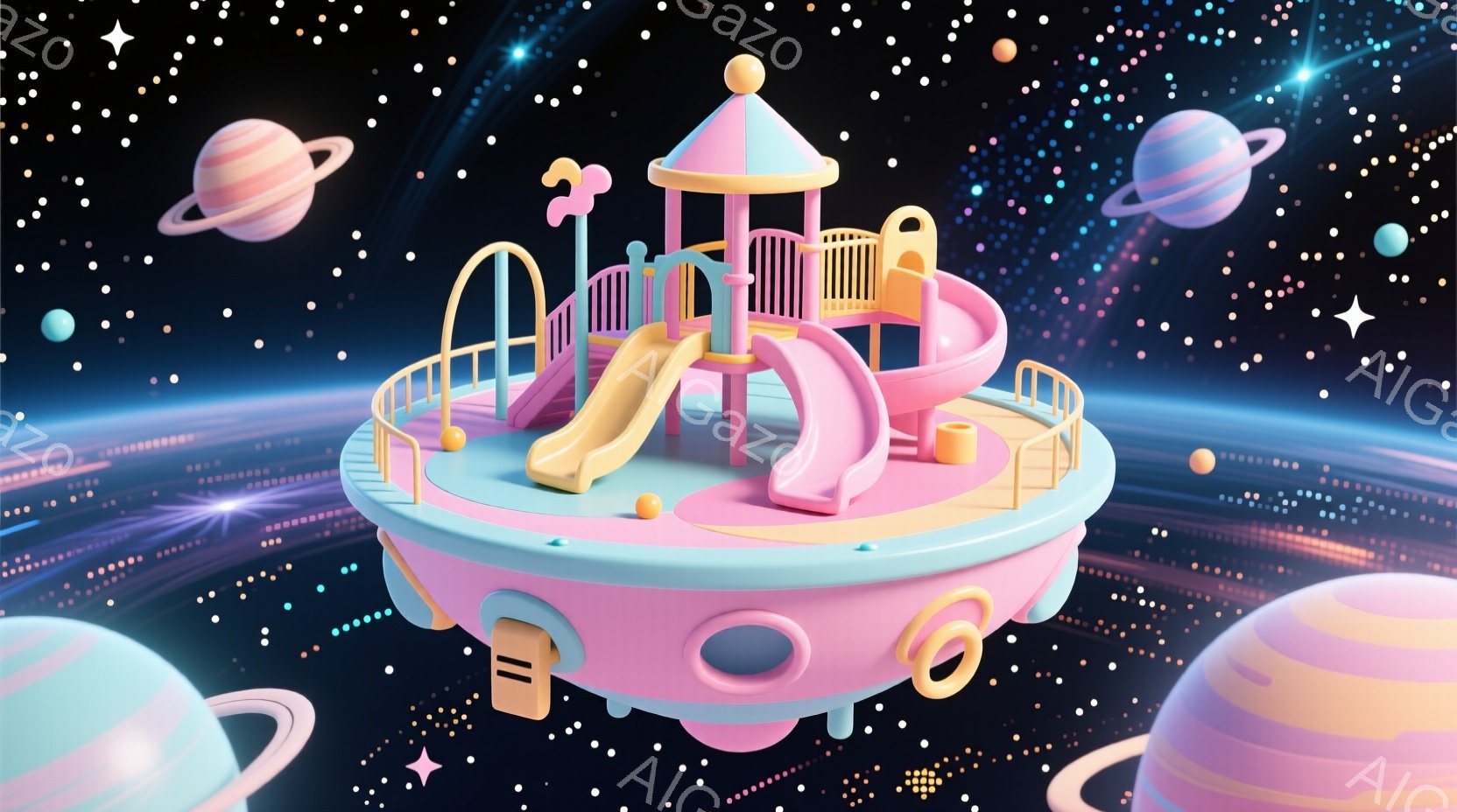 鮮やかなピンクと水色の遊具が、星空を背景に浮かぶ遊園地を描いています。遊具は丸いプラットフォームの上に配置され、パステルカラーの惑星が周囲を漂う幻想的な光景です。全体的に柔らかく可愛らしい雰囲気で、子供向けのイラストレーションのようです。