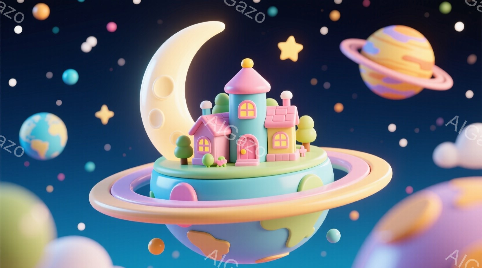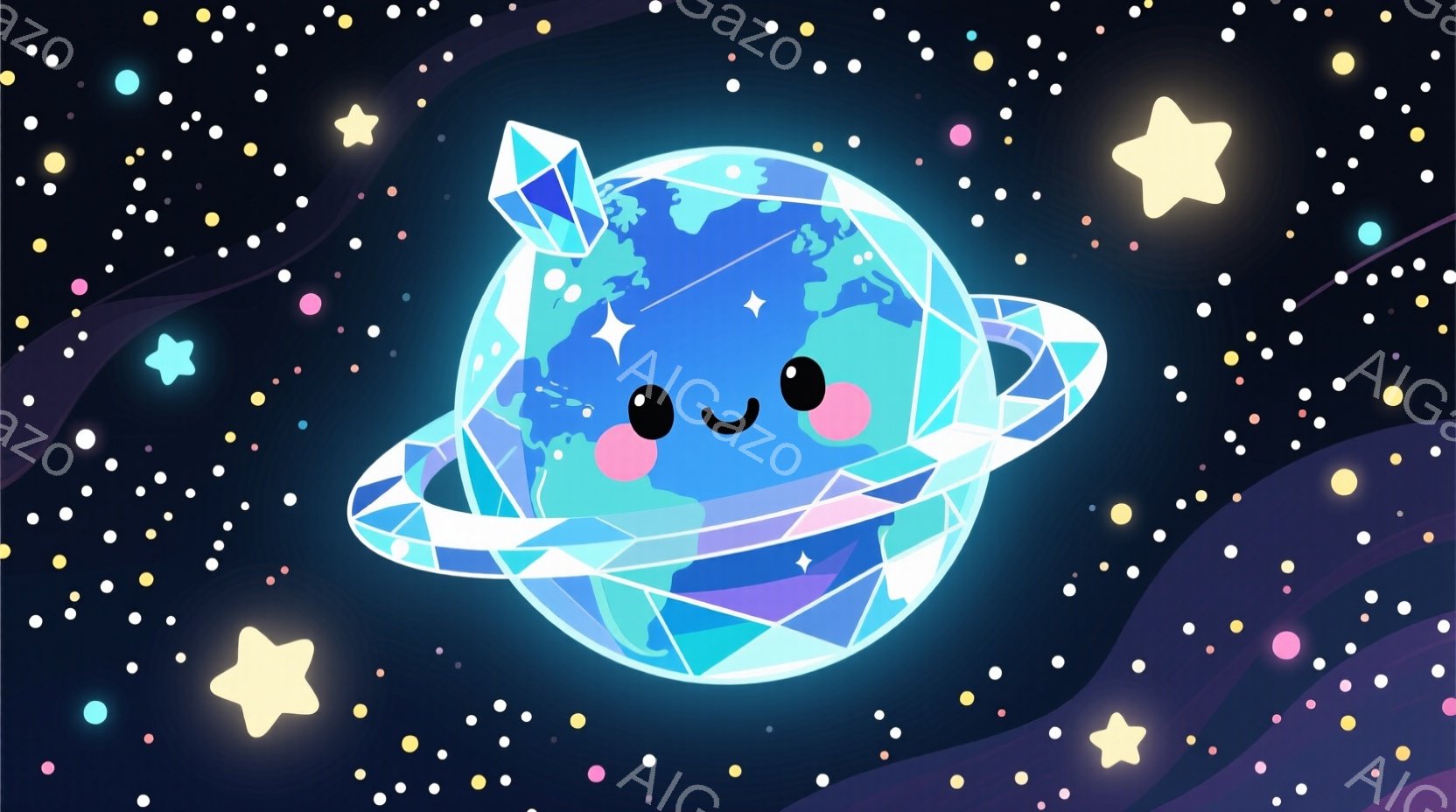 鮮やかな青と紫色のダイヤモンドのような惑星が、愛らしい笑顔を浮かべて中央に浮かんでいます。背景は濃い青色で、星や他の惑星の断片が散りばめられ、神秘的な宇宙空間を表現しています。全体的に、明るく、ファンタジックで、夢のような雰囲気です。