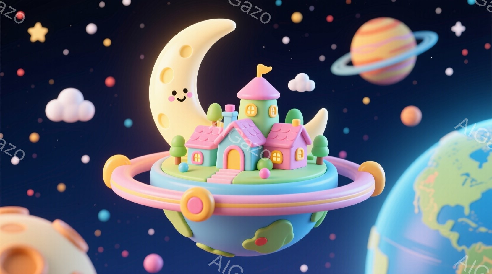 鮮やかな色彩のファンタジックな惑星が描かれています。空色の球体には緑の丘とピンクの線が走り、その上には可愛らしいピンク色の家々が並び、月型のオブジェが配置されています。背景には雲や星、そして土星のような惑星が浮かび、夢のような雰囲気を醸し出しています。