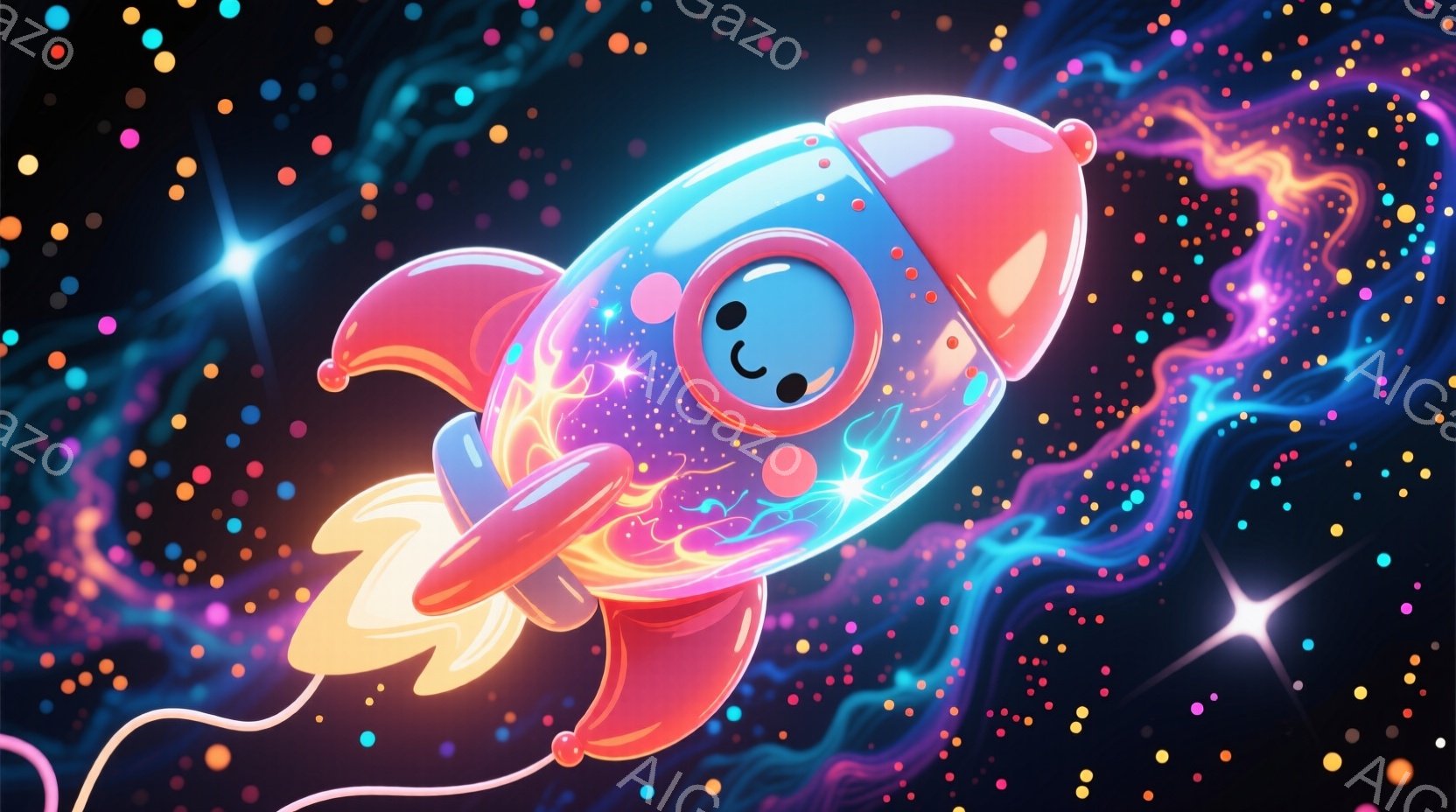 宇宙空間を走るような淡い水色と紫色の電車が描かれています。電車の周囲には星が散りばめられ、遠くにはピンクと紫色の銀河が広がっており、幻想的な雰囲気を醸し出しています。線路は宇宙空間に浮かび、まるで夢の中の光景のようです。