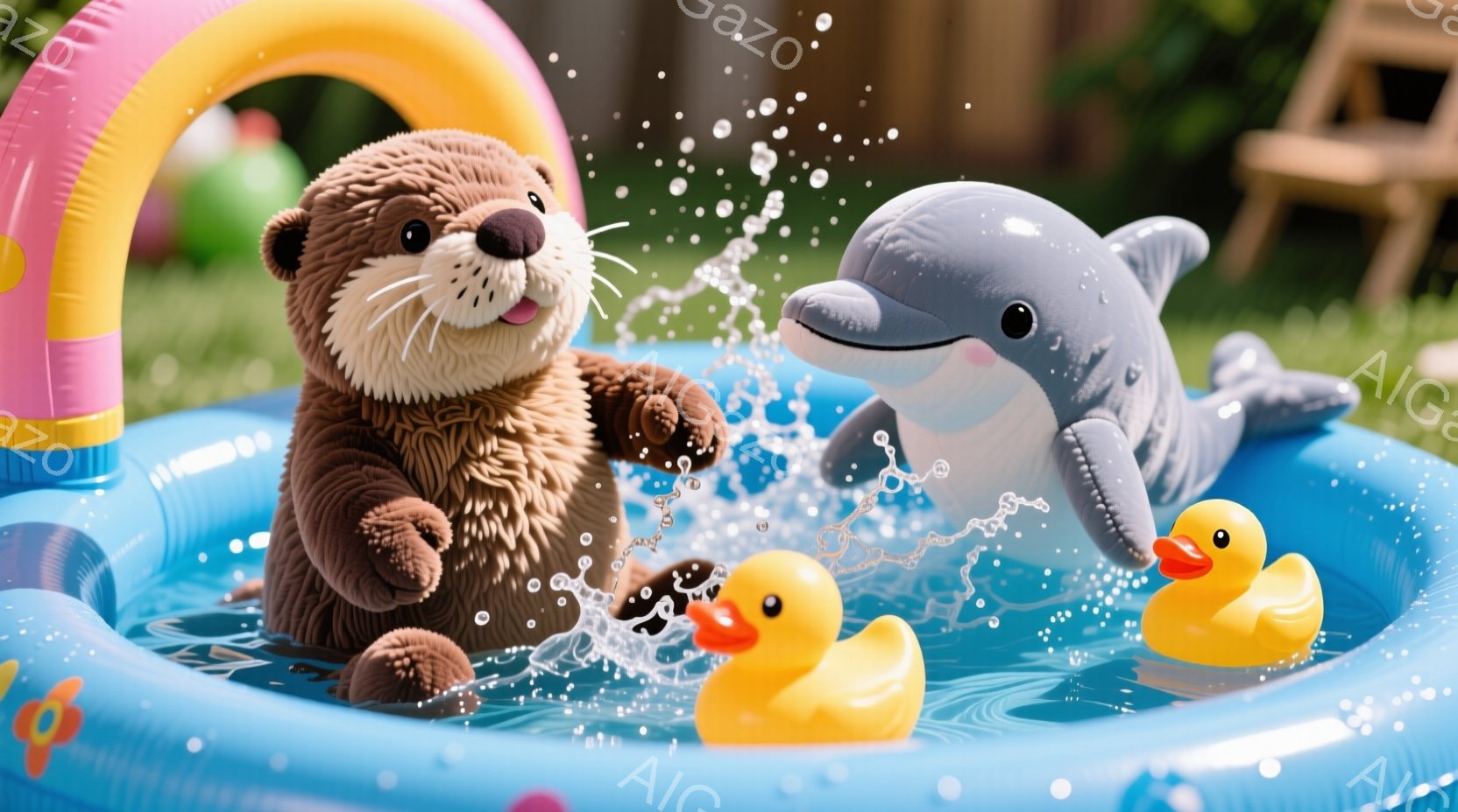 明るい青いプールの中に、ふわふわの茶色のカワウソのぬいぐるみと、白いイルカのぬいぐるみ、そして黄色いアヒルの水遊び用のおもちゃが浮かんでいます。カワウソは口を開けて微笑んでおり、水しぶきが上がっています。背景には緑豊かな自然が広がり、晴れた日の楽しい水遊びの雰囲気が伝わってきます。