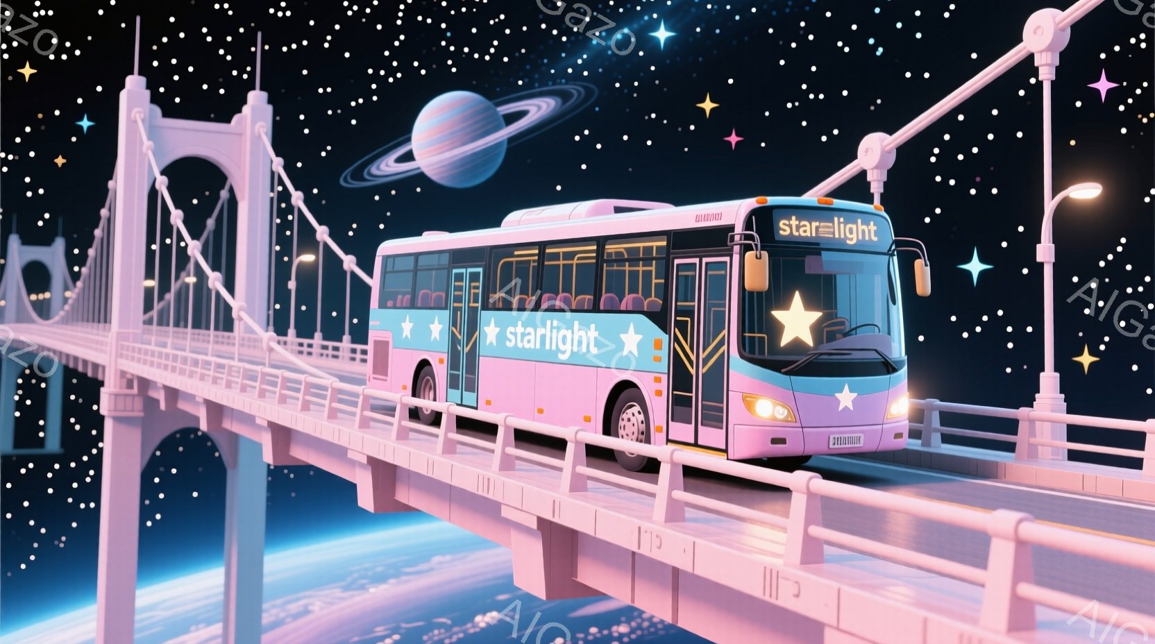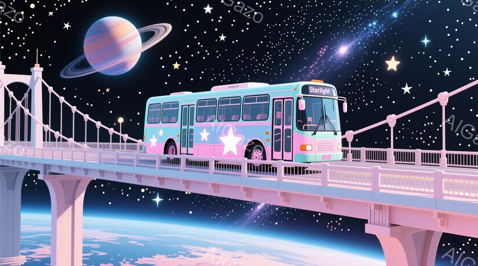 星が散りばめられた夜空を背景に、虹色の装飾が施されたバスが未来的な橋の上を走行している様子を描いています。地球と他の惑星が遠くに見え、バスのヘッドライトが光り、幻想的な雰囲気を醸し出しています。全体的に、宇宙旅行や夢のような冒険を連想させる、鮮やかでカラフルなイラストです。