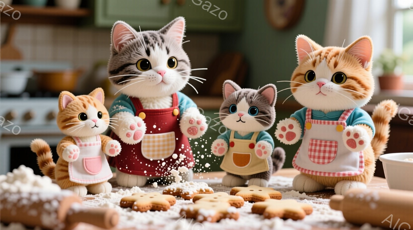小麦粉が舞うキッチンで、エプロンを着た猫たちが写っています。中央の白黒猫は少し驚いた表情で、小麦粉を蹴り上げているようです。他の2匹の猫はそれぞれオレンジとグレーで、同じエプロンを着て、可愛らしい表情でカメラを見つめています。