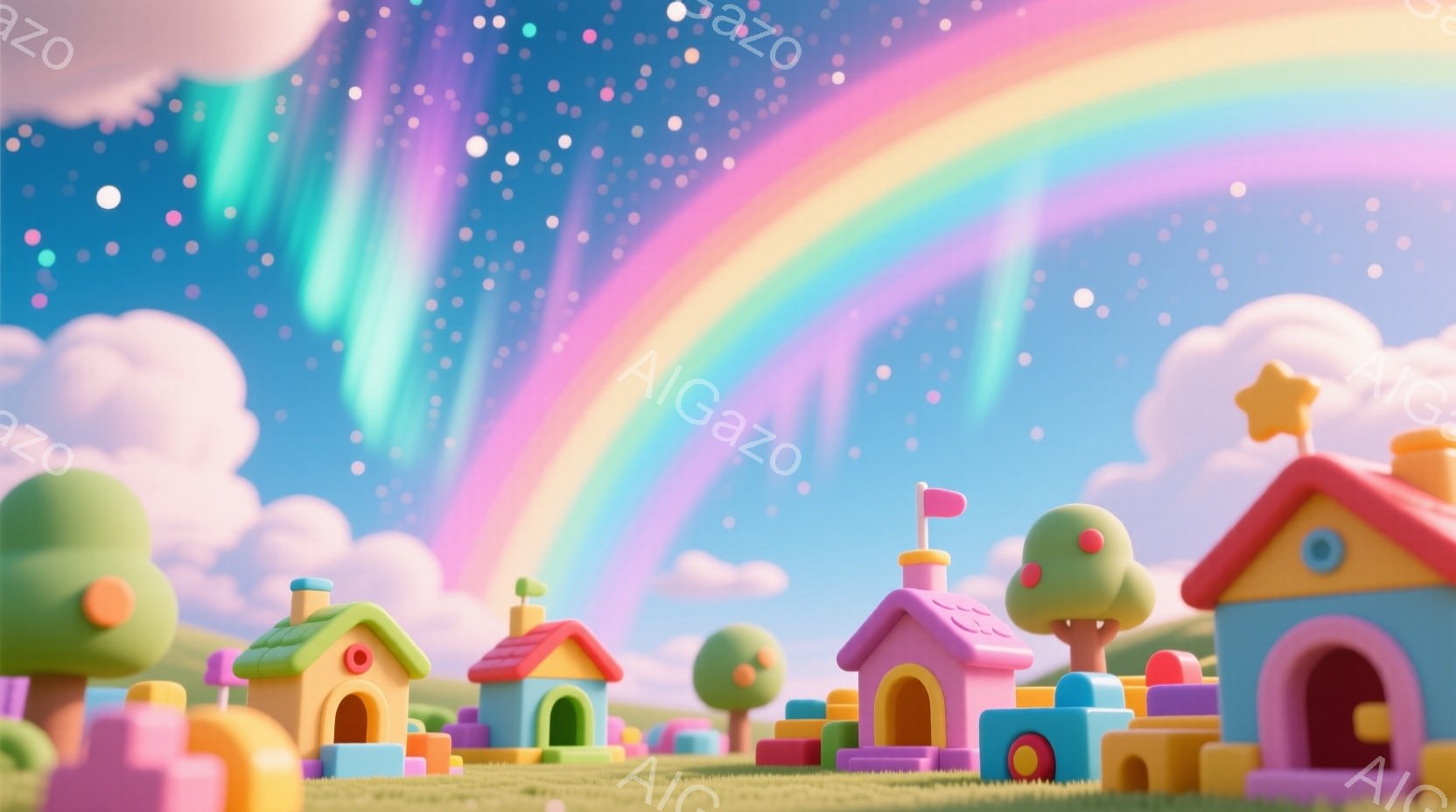 カラフルな子供用のおもちゃの家々が緑の芝生の上に並び、青空と虹が背景に広がっています。家々はそれぞれ異なる色と形をしており、遊び心に満ちた雰囲気を醸し出しています。雲が浮かび、全体的に夢のような、明るく陽気な光景です。