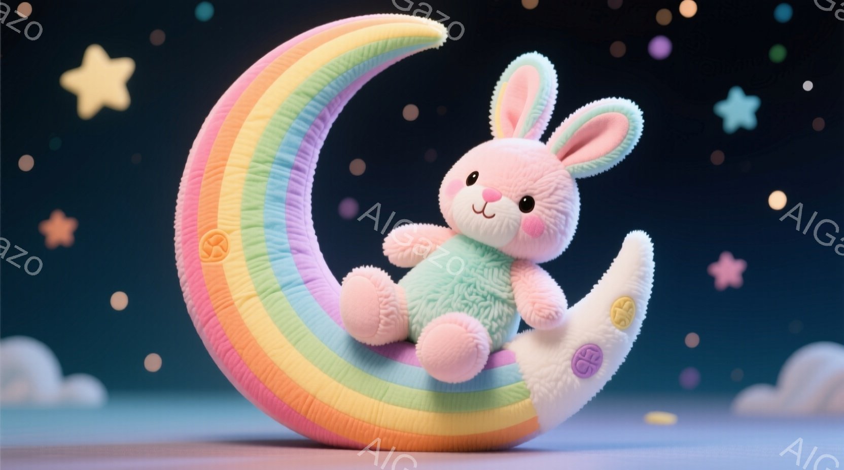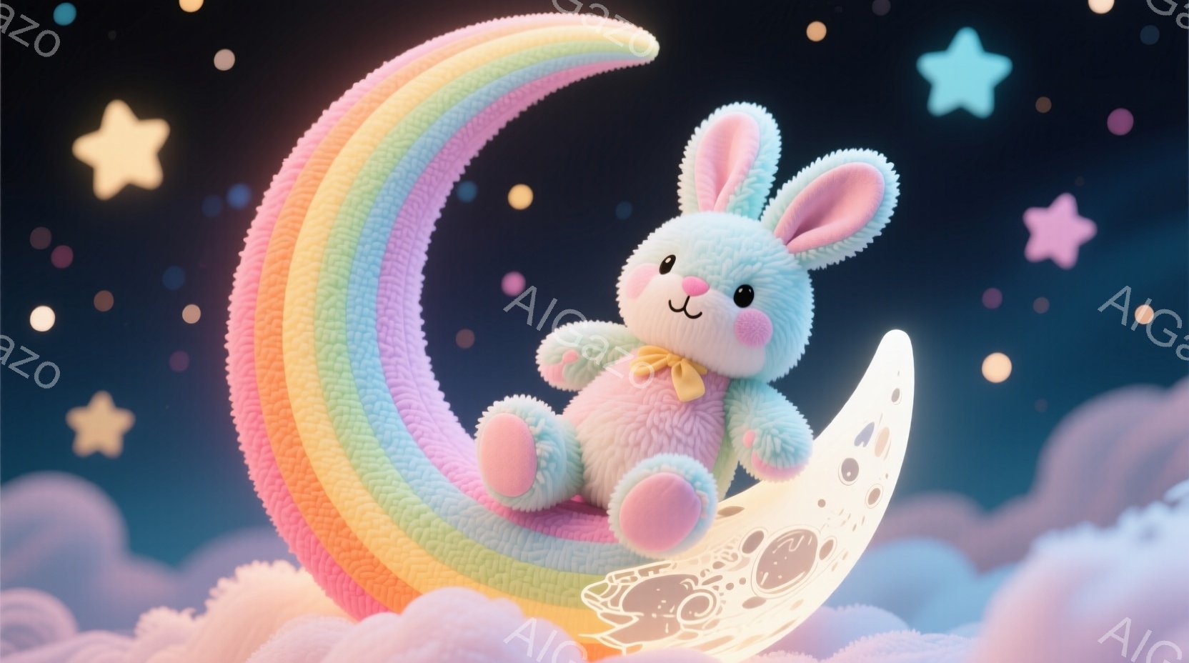 ふわふわの白い子ウサギが、虹色に輝く三日月の上に座っています。ウサギはピンク色のリボンと蝶結びの付いた服を着ており、穏やかな笑顔を浮かべています。背景には雲と星が散りばめられ、夢のような幻想的な雰囲気を醸し出しています。