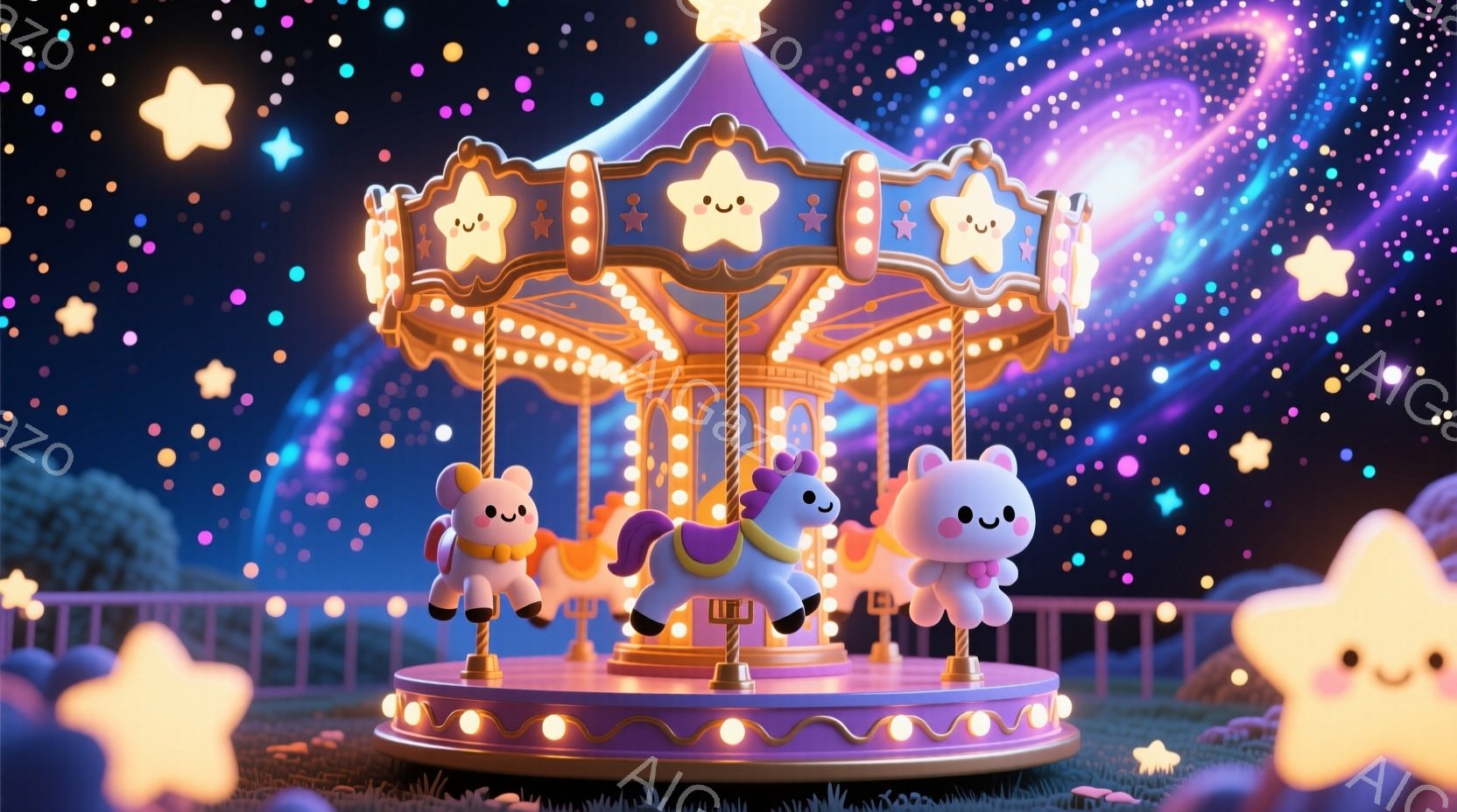鮮やかな色彩のメリーゴーランドが、紫色の芝生の上に設置されています。各乗り物は愛らしい表情をしており、ピンクや水色の優しい色合いで統一されています。背景には星が輝き、夢のような幻想的な雰囲気を醸し出しています。