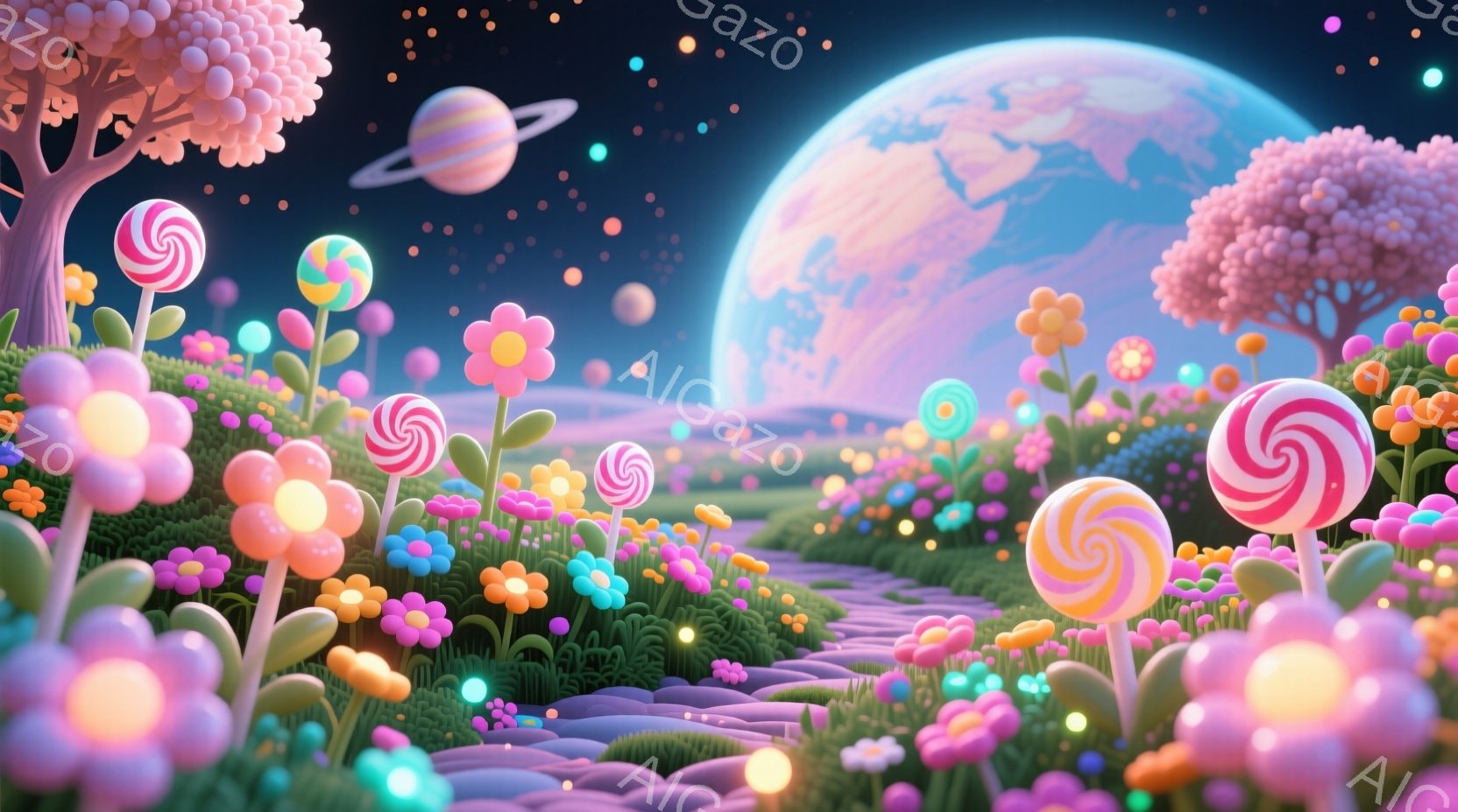 広大で幻想的な風景が広がっており、カラフルな花々やキャンディのようなオブジェクトが咲き乱れている。背景には、渦巻く雲を持つ巨大な惑星が浮かび、夜空には星々が輝いている。全体的に、夢のような、遊び心のある、そして鮮やかな雰囲気で満たされている。