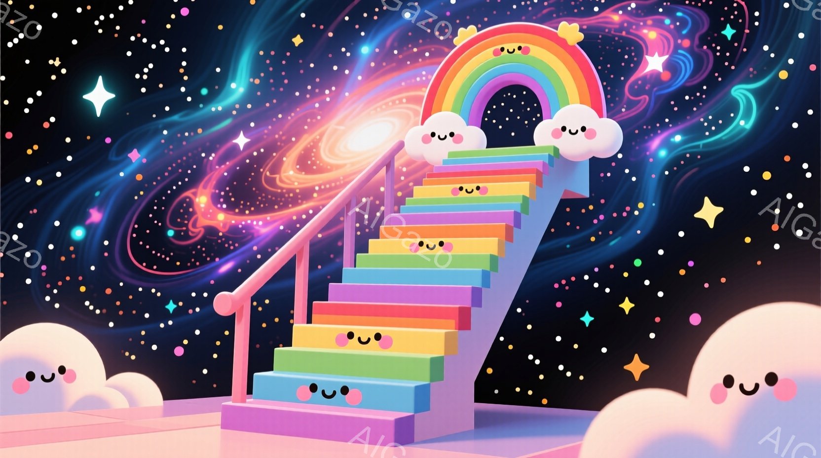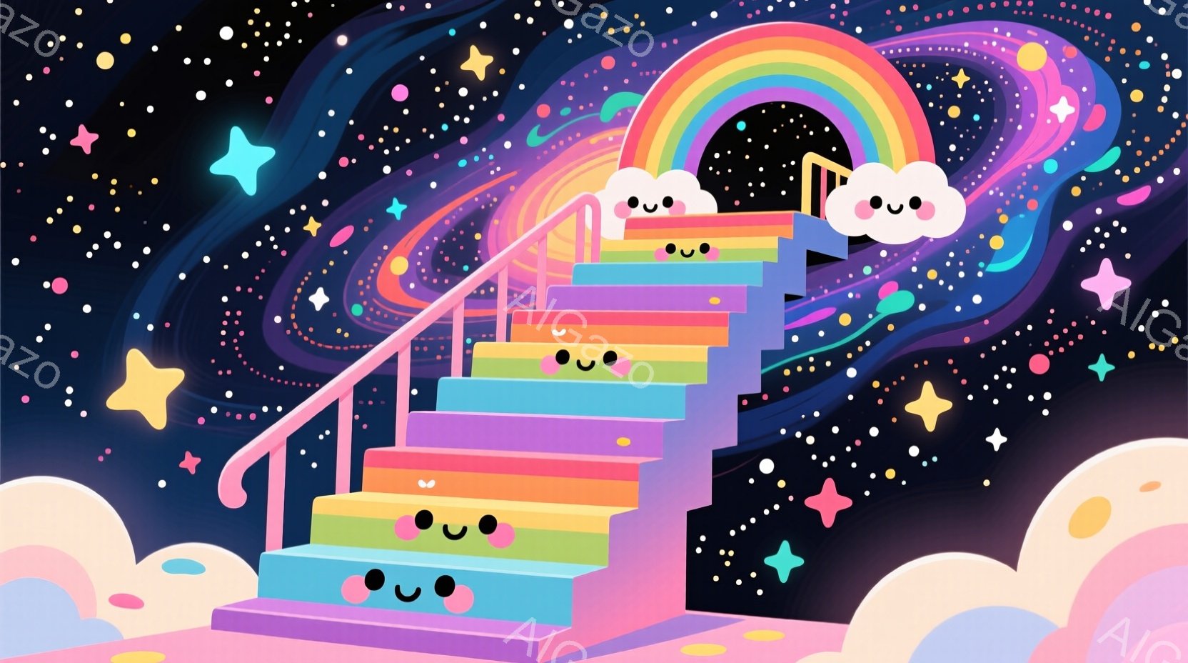 カラフルな虹色の階段が、星空と雲を背景に描かれています。階段はピンク色から始まり、紫、青、緑、黄、オレンジ、赤と色彩豊かに変化し、可愛らしい雲が両側に浮かんでいます。背景には、渦巻く銀河やきらめく星々が散りばめられ、夢幻的で幻想的な雰囲気を醸し出しています。