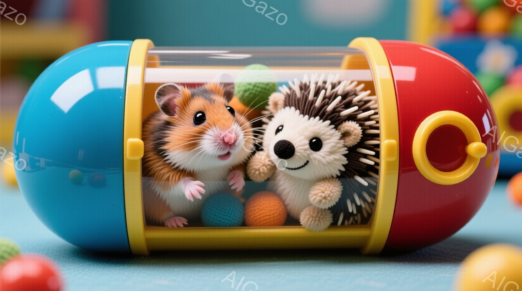 ハムスターとハリネズミのぬいぐるみのおもちゃが、青と赤の筒状のプラスチック製のおもちゃの中にいます。ハムスターは少し口を開けて微笑んでおり、ハリネズミは小さく微笑んでいます。背景には、様々な色のボールが散らばっており、明るく遊び心のある雰囲気です。