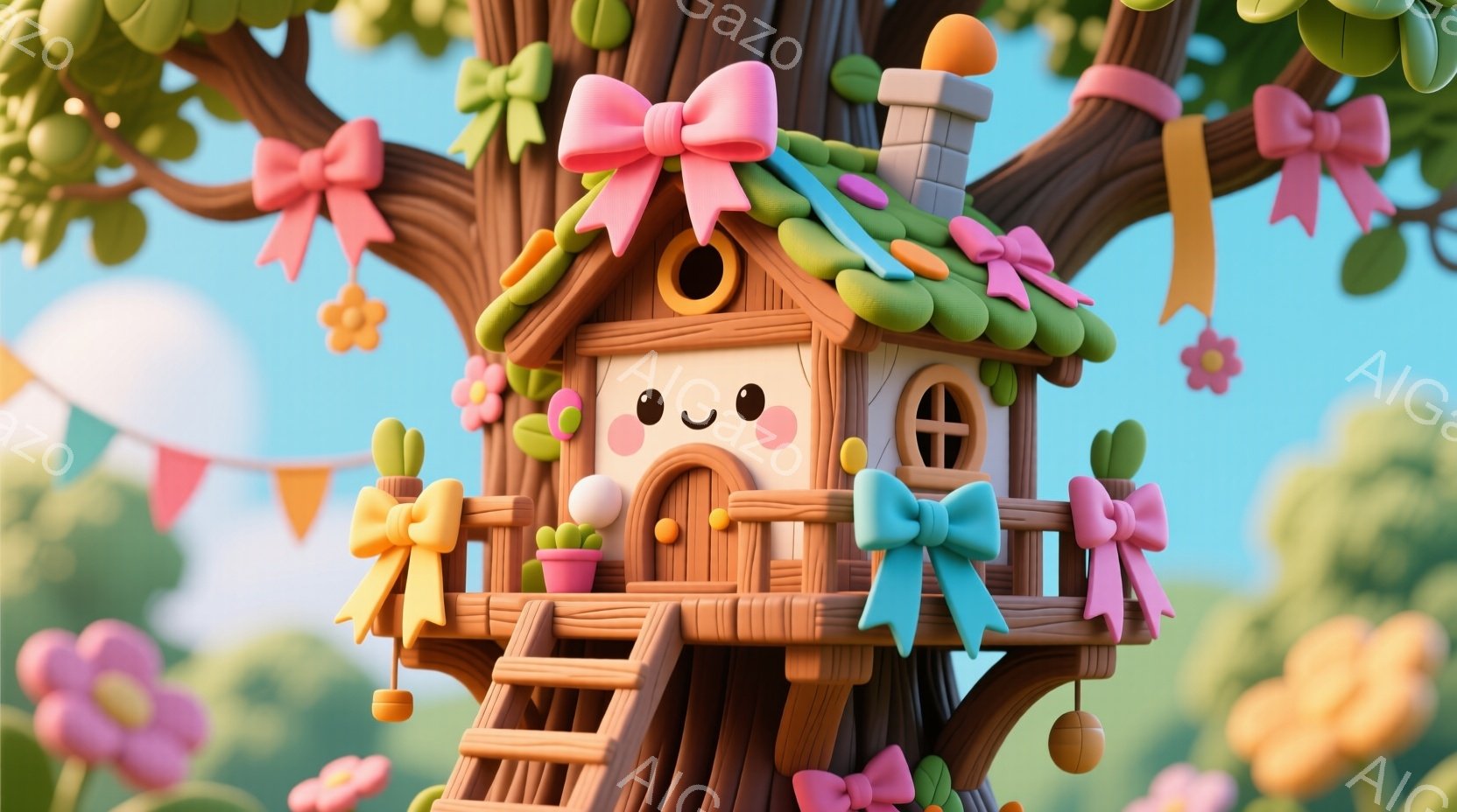 暖かく可愛らしいツリーハウスが描かれています。白い頬を持つ小さなキャラクターが、ピンクのドアの前で微笑んでおり、周囲にはピンクや水色のリボン、花、星が飾られています。背景は、明るい青空と緑豊かな自然で、全体的に夢のような雰囲気です。