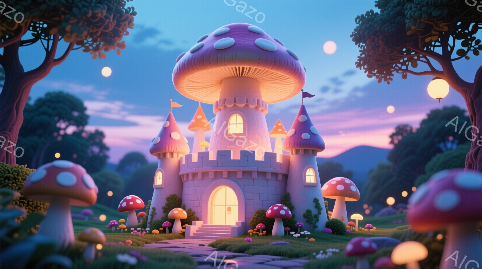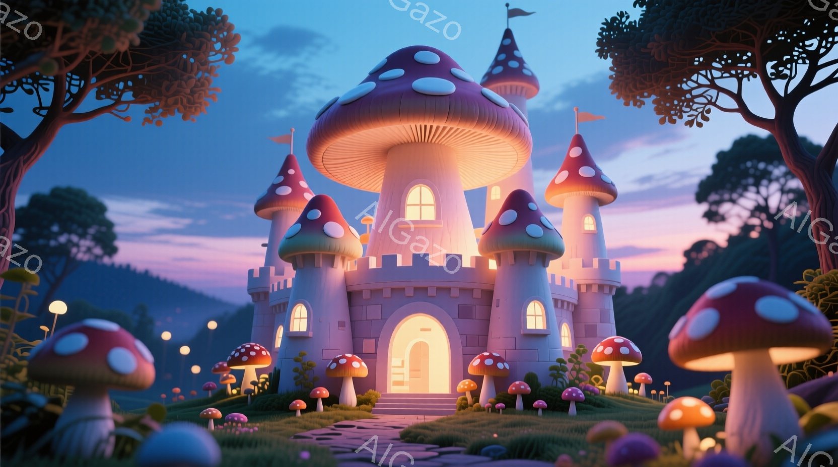 鮮やかな夕焼けを背景に、キノコのような形をした可愛らしいお城が描かれています。お城はピンク色で、周囲には様々な大きさのキノコが生い茂り、まるでファンタジーの世界のようです。庭には小道があり、お城へと続いており、全体的に温かく、幻想的な雰囲気が漂っています。