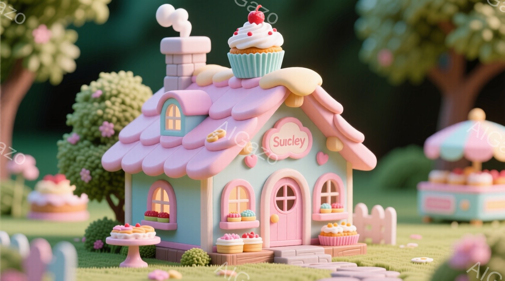 鮮やかなピンク色の家が、緑の芝生の上に建っています。屋根はカラフルなドーナツやカップケーキで飾られ、お菓子の家のような可愛らしい雰囲気が漂っています。背景にはぼやけた木々が見え、穏やかで夢のような世界観を演出しています。