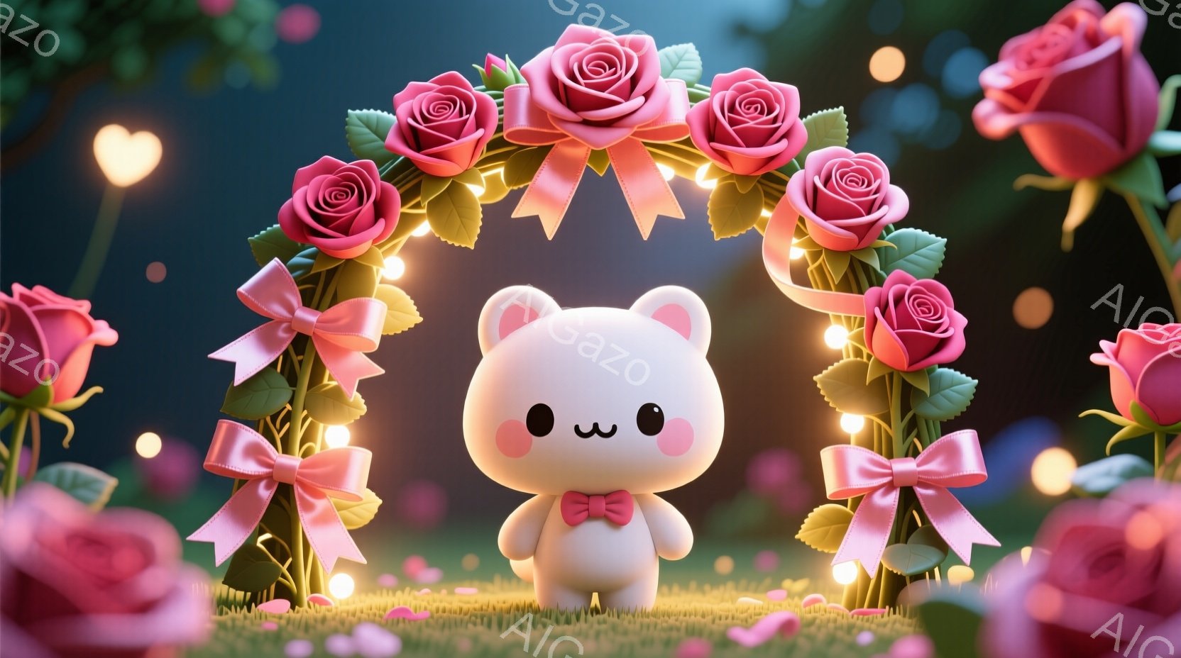 この無料AI生成画像「白くて丸いキャラクターが、ピンクのリボンと花で飾られたアーチの下に立っています。キャラクターは、ピンクの小さな帽子と蝶ネクタイをつけ、可愛らしい笑顔を浮かべています。背景には緑の草地と鮮やかなピンクの花が咲き乱れ、暖かく優しい雰囲気を醸し出しています。」は、2025年10月23日に作成されました。 サイズは 1664×928px の高解像度で、商用利用も可能なフリー素材として提供しています。