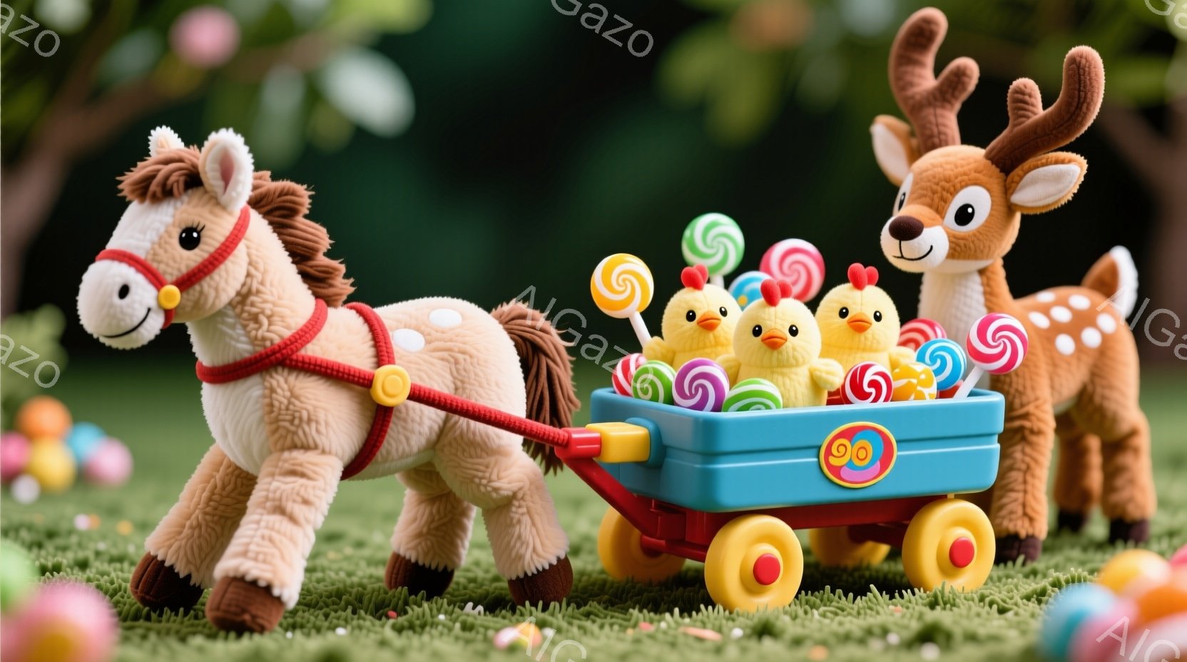 ぬいぐるみで作られた茶色の馬が、青いトレーラーを引いています。トレーラーには黄色いヒヨコたちとカラフルなキャンディが積み込まれており、茶色の鹿のぬいぐるみがトレーラーの後ろに立っています。背景には緑の芝生、カラフルな卵、キャンディ、そしてぼやけた木々が見え、春らしい、遊び心のある雰囲気を醸し出しています。