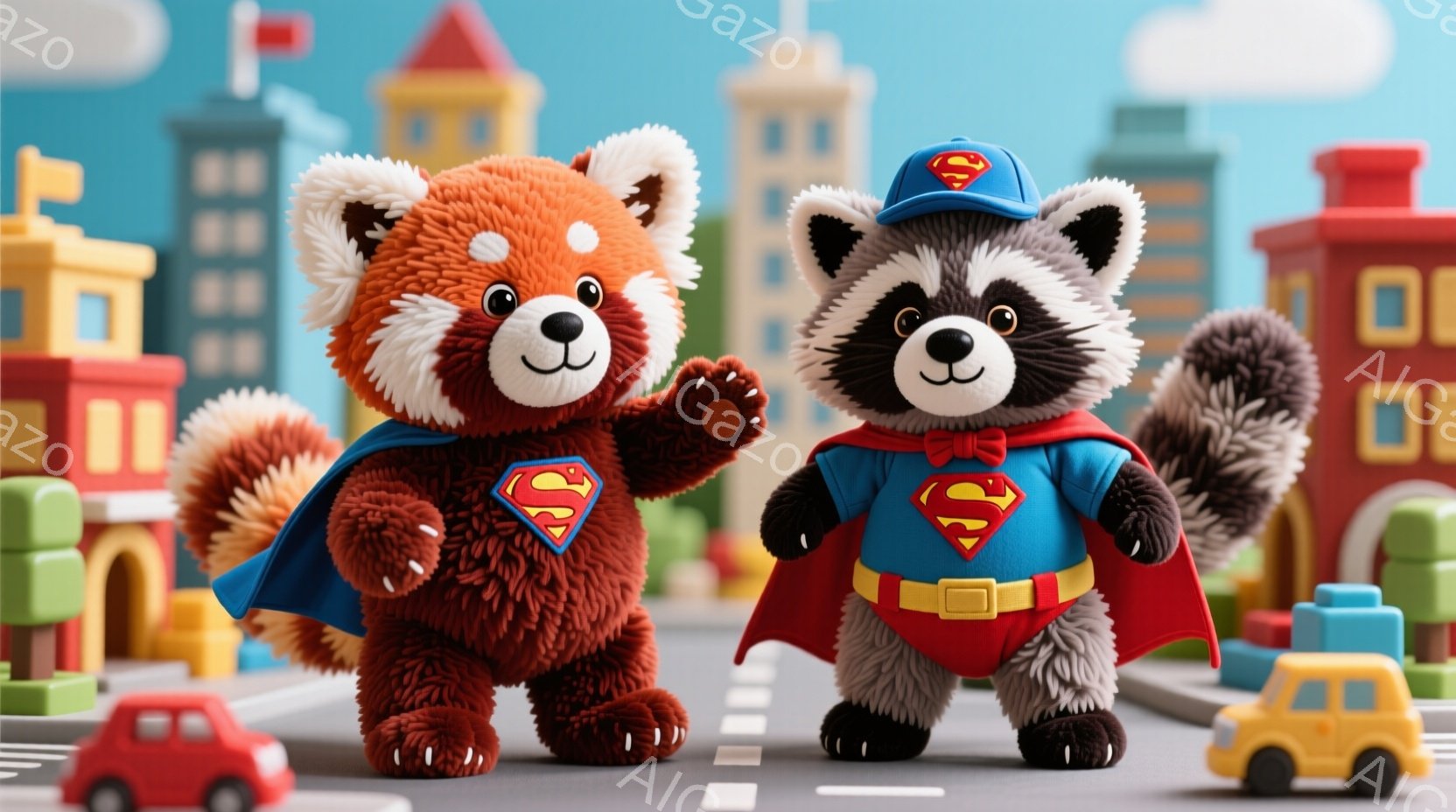 赤いパンダとアライグマの2匹が、それぞれ赤いケープと青いケープを羽織り、頭にはスーパーマンのロゴが入った帽子をかぶっています。2匹とも前足を前に出し、遊歩道を進むようなポーズをとっており、顔には楽しげな表情が浮かんでいます。背景にはカラフルな建物や車が配置されており、明るい日差しと合わせて、子供向けの楽しい雰囲気を醸し出しています。