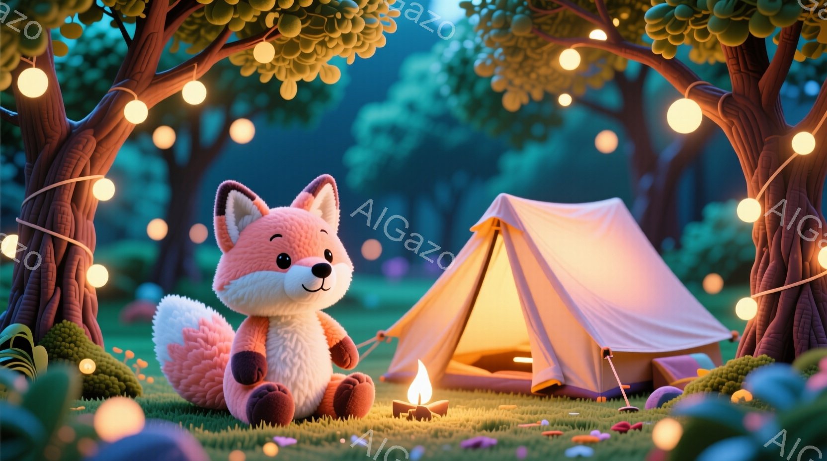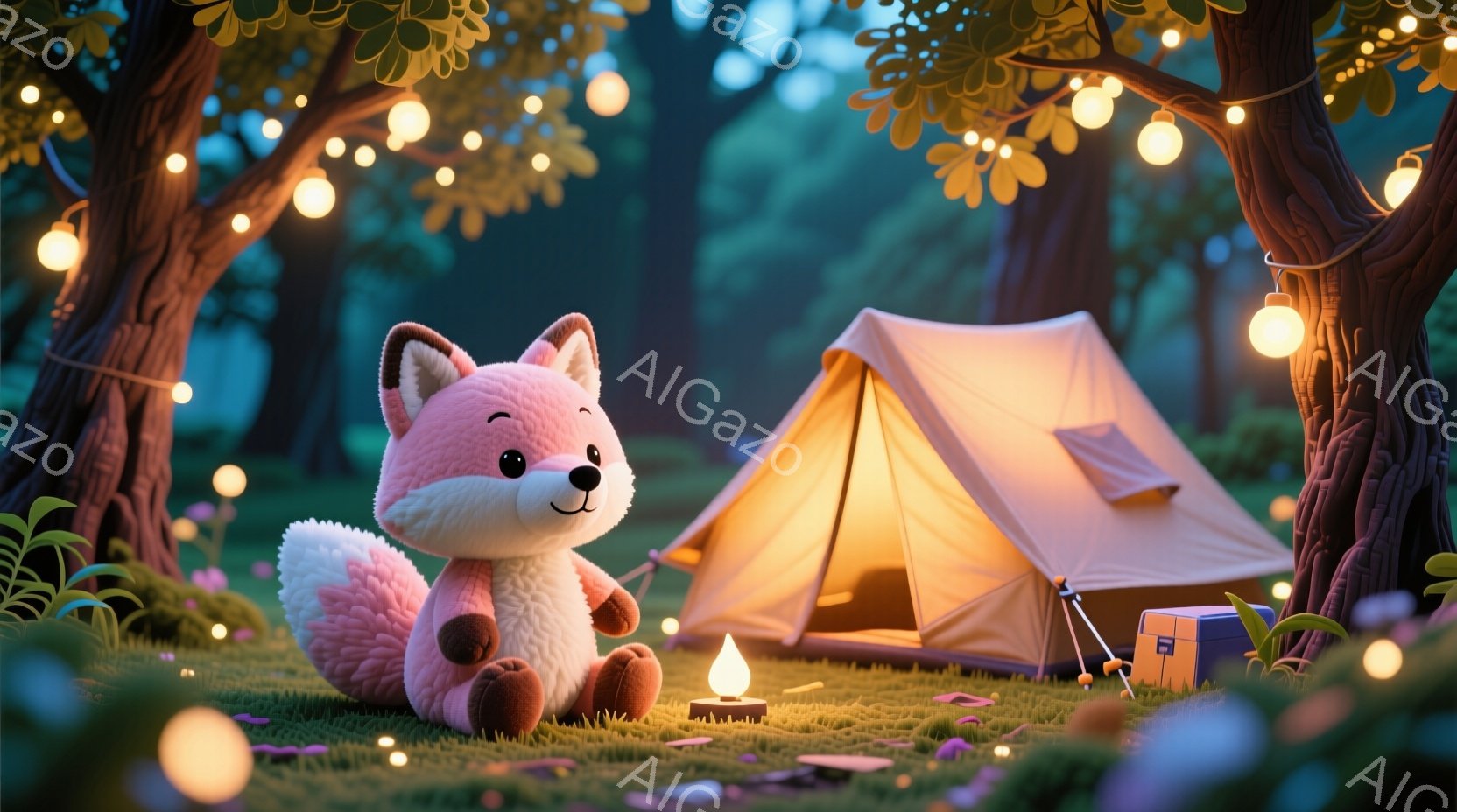 明るいピンク色の毛並みを持つ、愛らしいキツネのぬいぐるみです。キツネは芝生の上に座り、穏やかな笑顔を浮かべています。背景には、電飾で飾られた木々と、ほのかな光を放つテントがあり、暖かく幻想的なキャンプ場の雰囲気を醸し出しています。