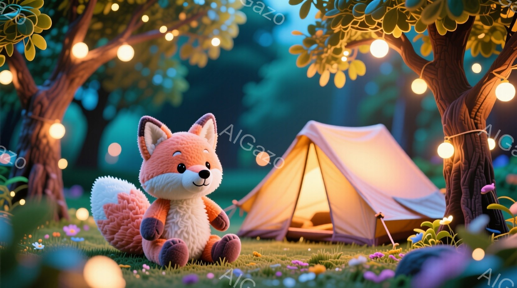 明るい緑の芝生の上に、可愛らしいピンク色のキツネが座っています。キツネは大きな目で穏やかな表情をしており、背景には小さなテントと青いクーラーボックスが見えます。 木々の間には光る小さな電球が散りばめられ、温かく幻想的なキャンプの雰囲気を演出しています。