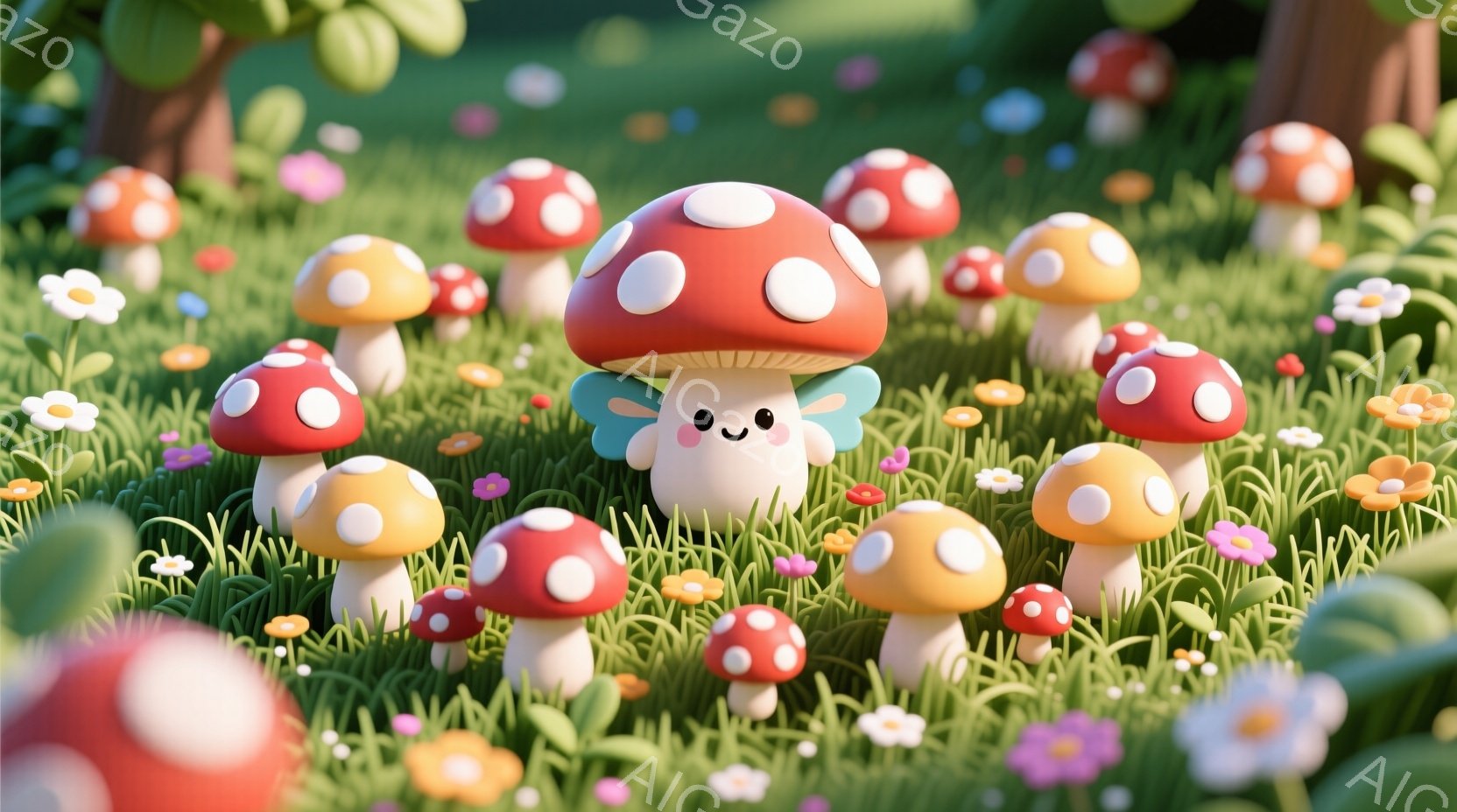 広々とした緑の草原に、様々な色の可愛らしいキノコたちが密集して生えています。一部のキノコは赤い傘に白い水玉模様で、他のキノコは黄色やオレンジ色で、それぞれ愛らしい表情をしています。背景には色とりどりの小さな花々が咲き乱れ、全体的に明るく、温かく、幻想的な雰囲気を醸し出しています。