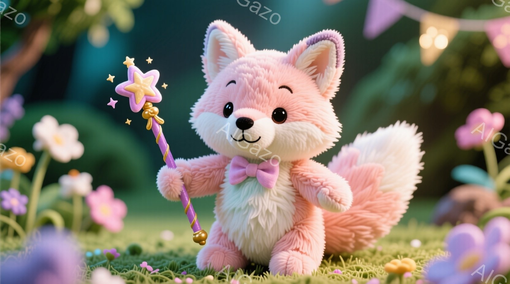 ふわふわのピンク色の毛並みを持つ子犬が、ターコイズブルーのリボンをつけて座っています。子犬は右手に星型の杖を持ち、少し上目遣いで優しい表情を浮かべています。背景には緑の草むらとピンクや白の花が咲き乱れ、星空が広がり、夢のような幻想的な雰囲気が漂っています。