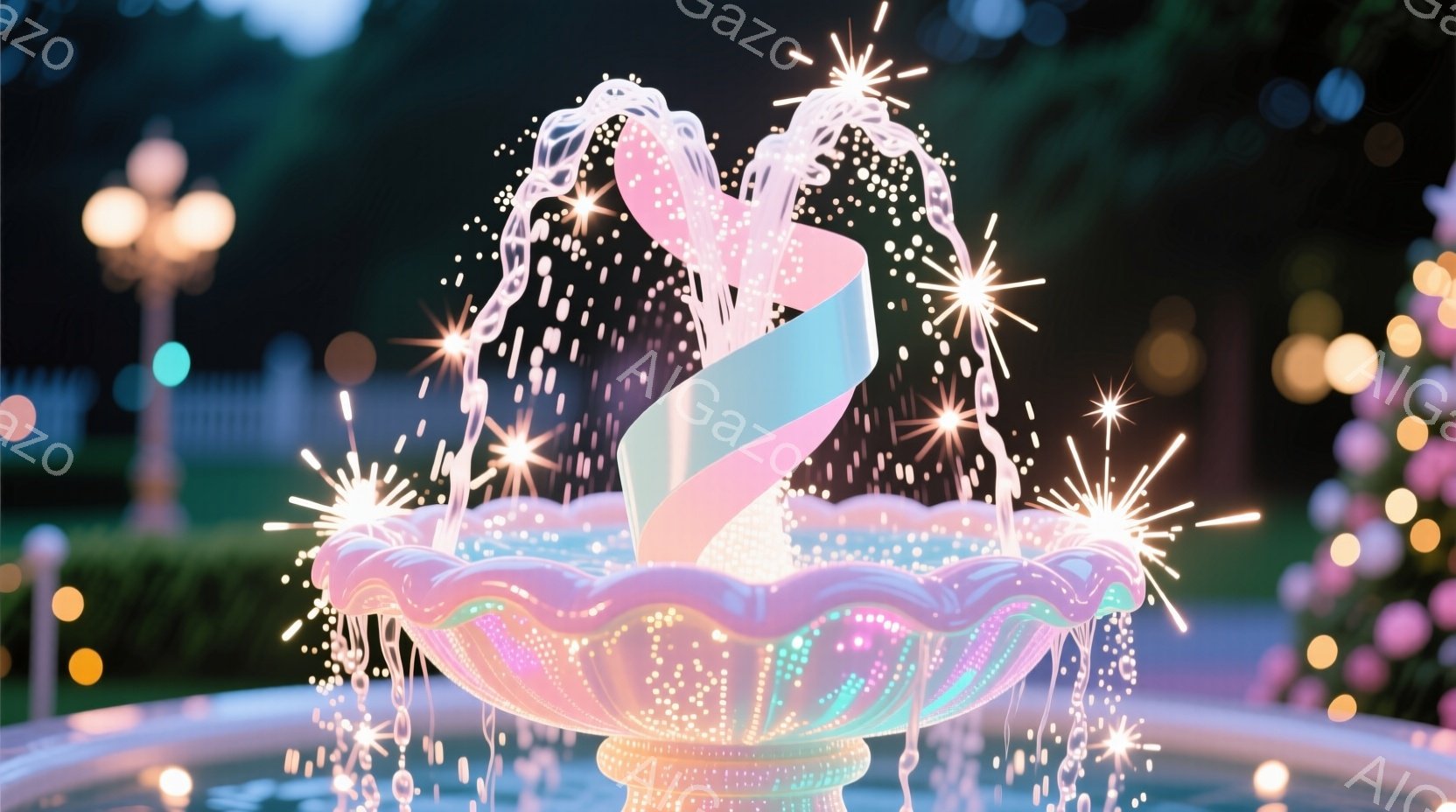 美しい噴水が夜の庭園で輝いている。噴水の水は空中に舞い上がり、ピンクのリボンとキラキラ光る粒子で飾られている。背景には緑豊かな植物とぼんやりとした光の柱が見え、幻想的な雰囲気を醸し出している。