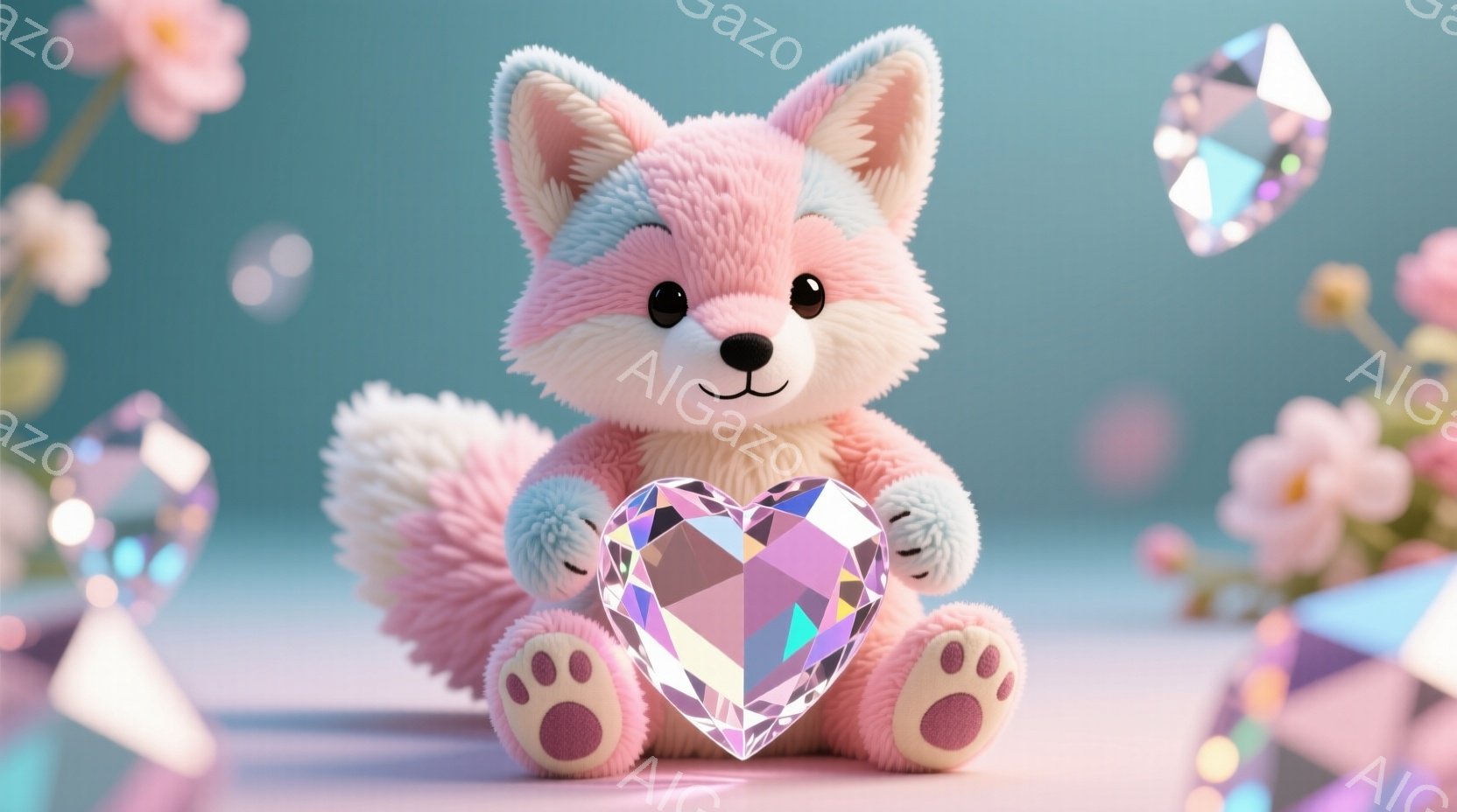 ふわふわのピンク色のキツネが、光り輝くハート型の宝石を抱えています。キツネは丸い体で座っており、つぶらな瞳と愛らしい表情をしています。背景には、光を反射する多面体のオブジェが散りばめられており、ファンタジーのような、夢幻的な雰囲気を醸し出しています。