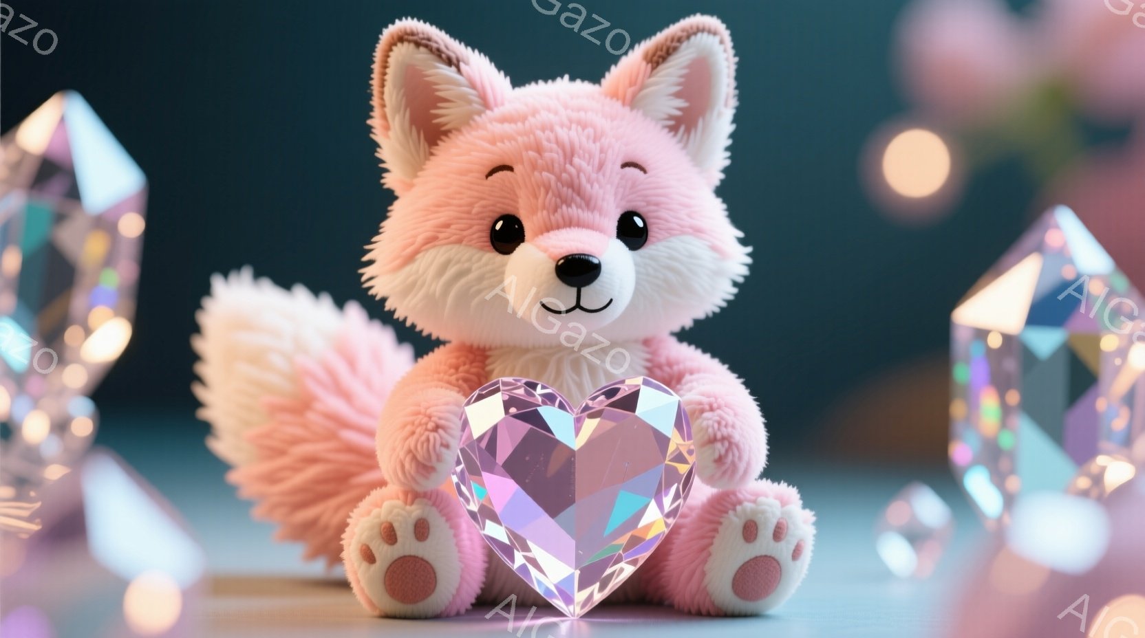 ふわふわのピンク色のキツネが、紫色のハート型の宝石を抱えています。 キツネは正面を向き、愛らしい表情で座っており、背景には様々な形のクリスタルや桜の花びらが散りばめられています。 全体的に、夢のような、甘くて優しい雰囲気が漂っています。