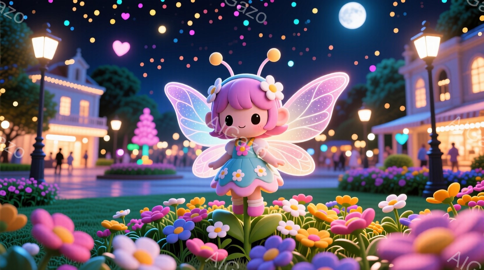 明るいピンク色の髪と大きな瞳を持つ、花を模した姿の小さな妖精が、他の花々に囲まれて咲き誇っています。夜の遊園地を背景に、ライトアップされた建物や、星が輝く空が広がり、幻想的な雰囲気を醸し出しています。妖精は可愛らしい笑顔で、まるで遊園地の一部であるかのように楽しそうにしています。