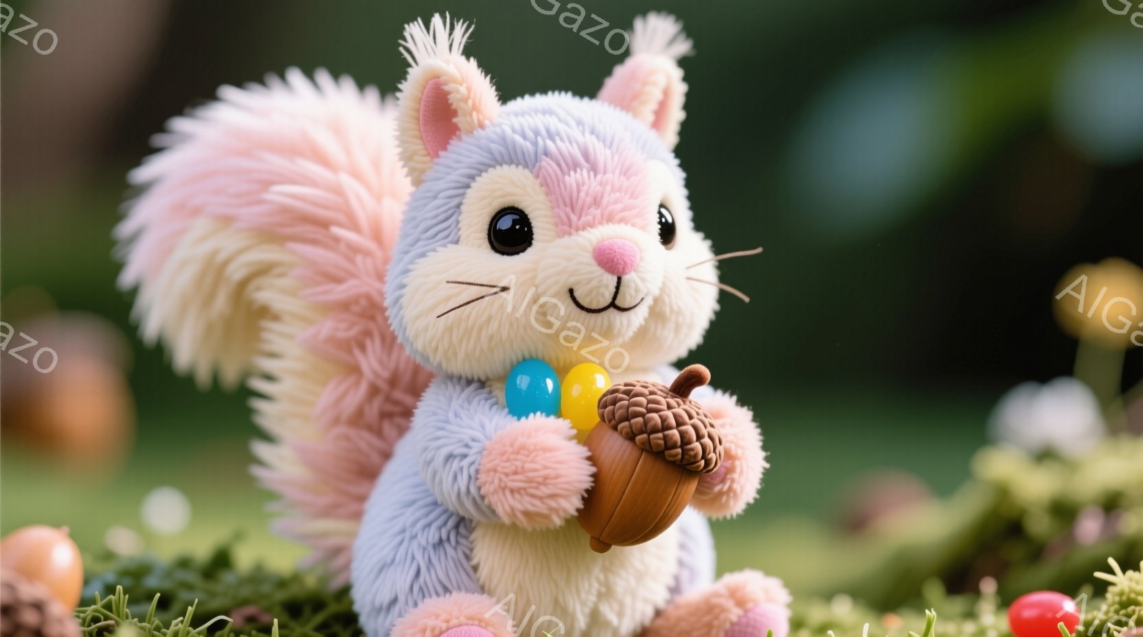 淡い紫色とピンク色のふわふわしたリスのぬいぐるみです。大きな茶色の目と小さな鼻を持ち、片手にドングリの形をしたおもちゃを持っています。背景には緑色の草のようなものと、ぼやけた他のドングリの飾りがあり、全体的に柔らかくて温かい雰囲気です。