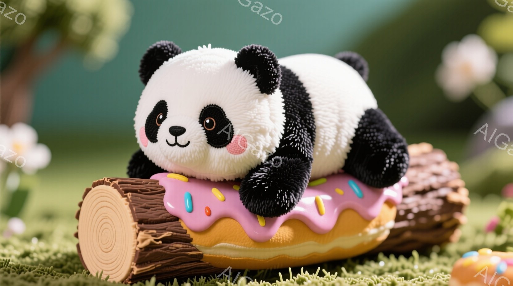 白と黒のパンダが、ピンク色のアイシングとカラフルなスプリンクルが飾られたドーナツ型の木の幹の上に横たわっています。パンダは丸くてふわふわしており、笑顔で、可愛らしい表情をしています。背景には緑の草とピンクと白の花が咲き乱れ、暖かく、遊び心のある雰囲気を醸し出しています。